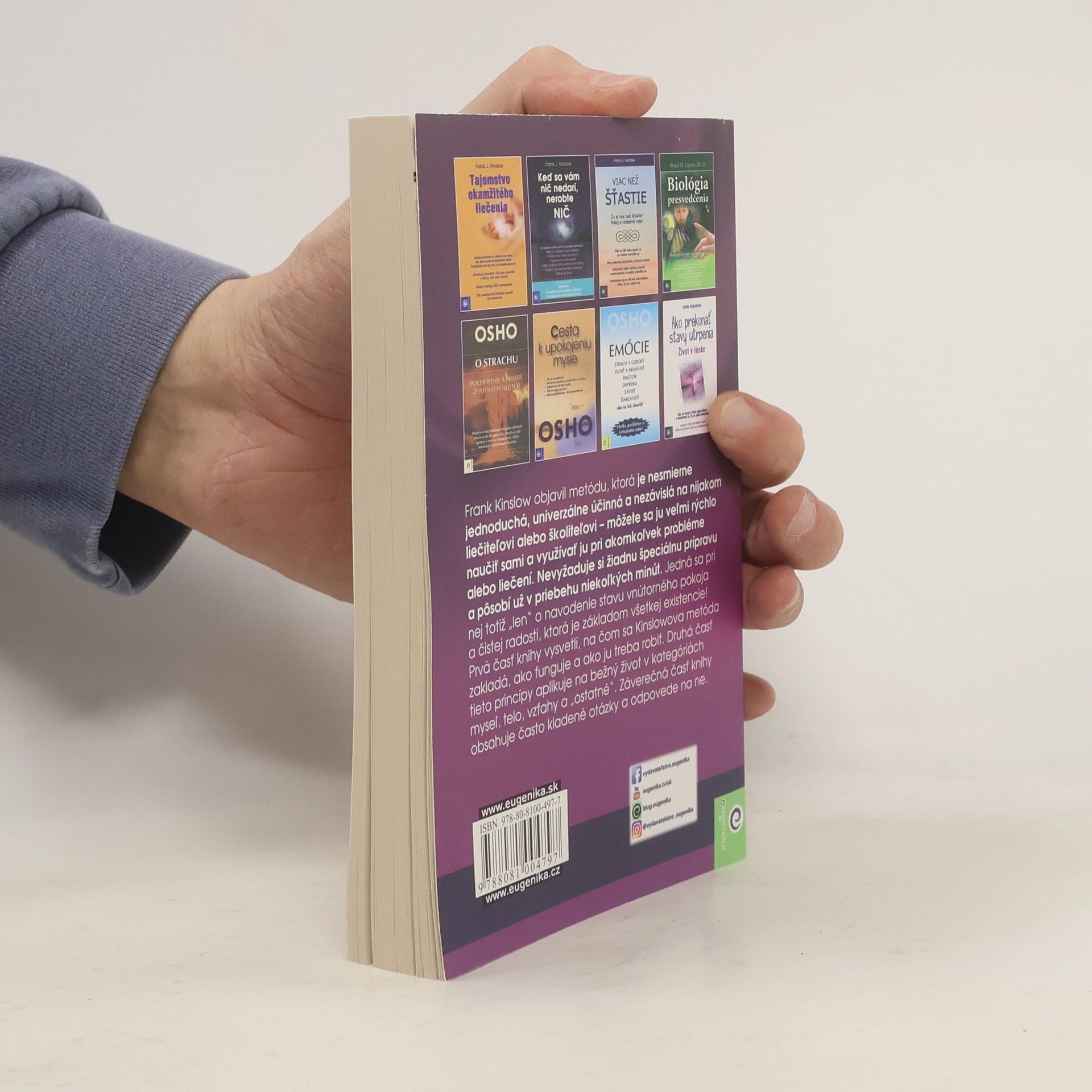 Frank Kinslow, autor knihy Tajomstvo okamžitého liečenia, vynašiel úžasnú metódu, ktorá je nesmierne jednoduchá, univerzálne účinná a nezávislá na nijakom liečiteľovi alebo učiteľovi – môžete sa ju veľmi rýchlo naučiť sami a využívať ju pri akomkoľvek probléme alebo nepohode. Nevyžaduje si žiadnu špeciálnu prípravu a pôsobí už v priebehu niekoľkých minút. Jedná sa pri nej totiž „len“ o navodenie stavu vnútorného pokoja a čistej radosti, ktorá je základom všetkej existencie. Prvá časť knihy zopakuje, na čom sa Kinslowova metóda zakladá, ako funguje a ako ju treba robiť. Základom sú pojmy a im zodpovedajúce stavy čisté uvedomenie a kvantové unášanie. Druhá časť tieto princípy aplikuje na bežný život človeka. Rozoberá sa tu niekoľko základných oblastí: myseľ, telo, vzťahy a „ostatné“. Pri mysli sa stretneme s negatívnymi emóciami a ukážeme si, ako sa ich zbaviť, pri tele sa zas budeme venovať liečeniu bolesti, ale aj zlepšeniu športovej výkonnosti. Vzťahy sú jasné: povieme si niečo o láske a sexe, ale tiež sa pozrieme na to, aký je vlastne dokonalý vzťah a či je možné dosiahnuť ho. Do časti „ostatné“ autor zaradil témy ako spánok a nespavosť, stravovanie, peniaze, deti a cestovanie. Záverečná časť knihy obsahuje často kladené otázky a odpovede na ne.