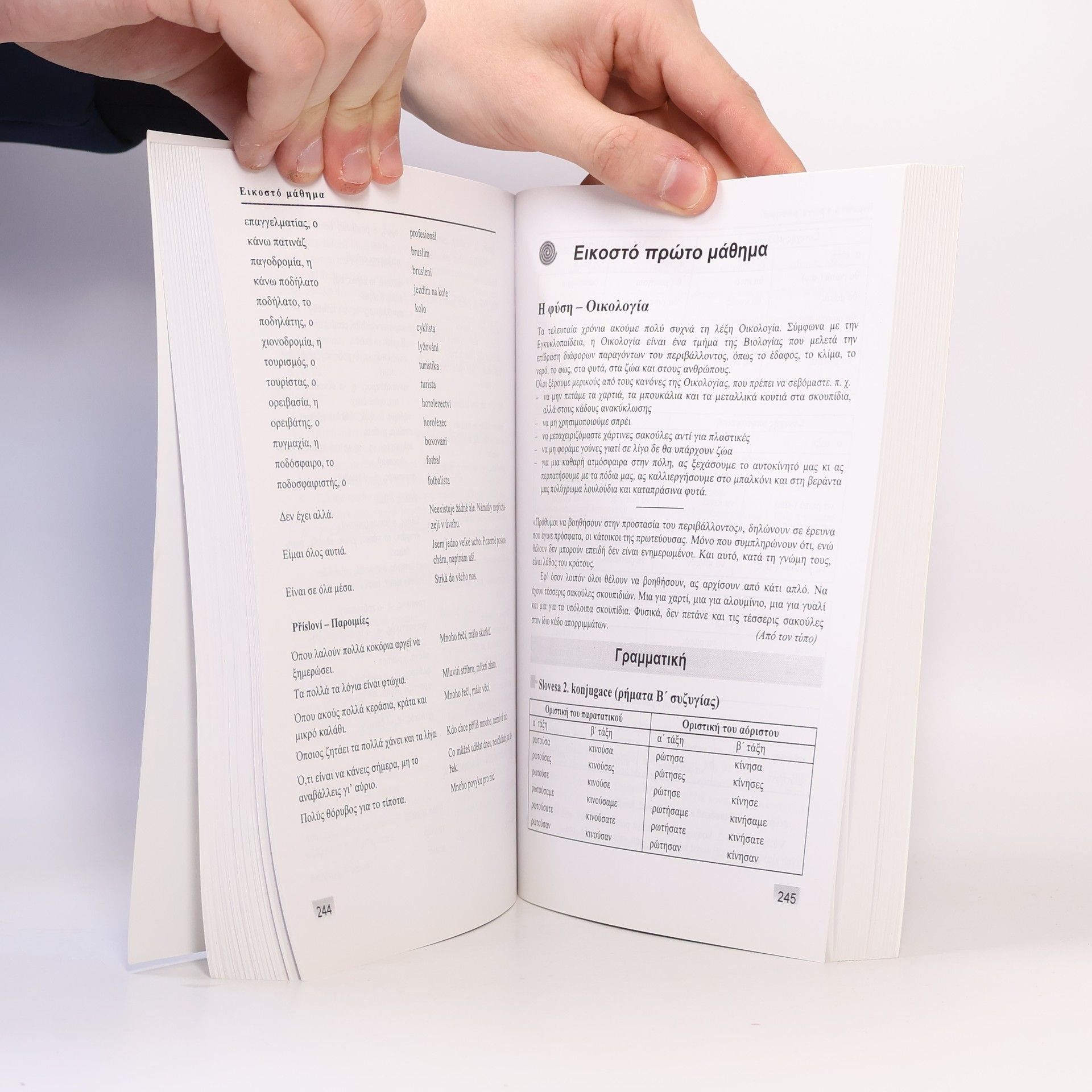 První česká učebnice novořečtiny s rozsáhlejšími řeckými a českými cvičeními, s poučením o gramatických, morfologických i syntaktických jevech a se základní slovní zásobou (3700 slov). Cvičebnice je založena na zkušenostech z výuky novořečtiny na Filozofické fakultě Masarykovy univerzity v Brně od roku 1993/94 a snaží se uživatele seznámit nejen s jazykem, ale i se základními informacemi o současném životě v Řecku a řecké kultuře. Témata cvičení v pokročilejší části učebnice byla volena s ohledem na témata státních zkoušek na Státní jazykové škole v Praze tak, aby učebnice mohla sloužit i posluchačům této školy.