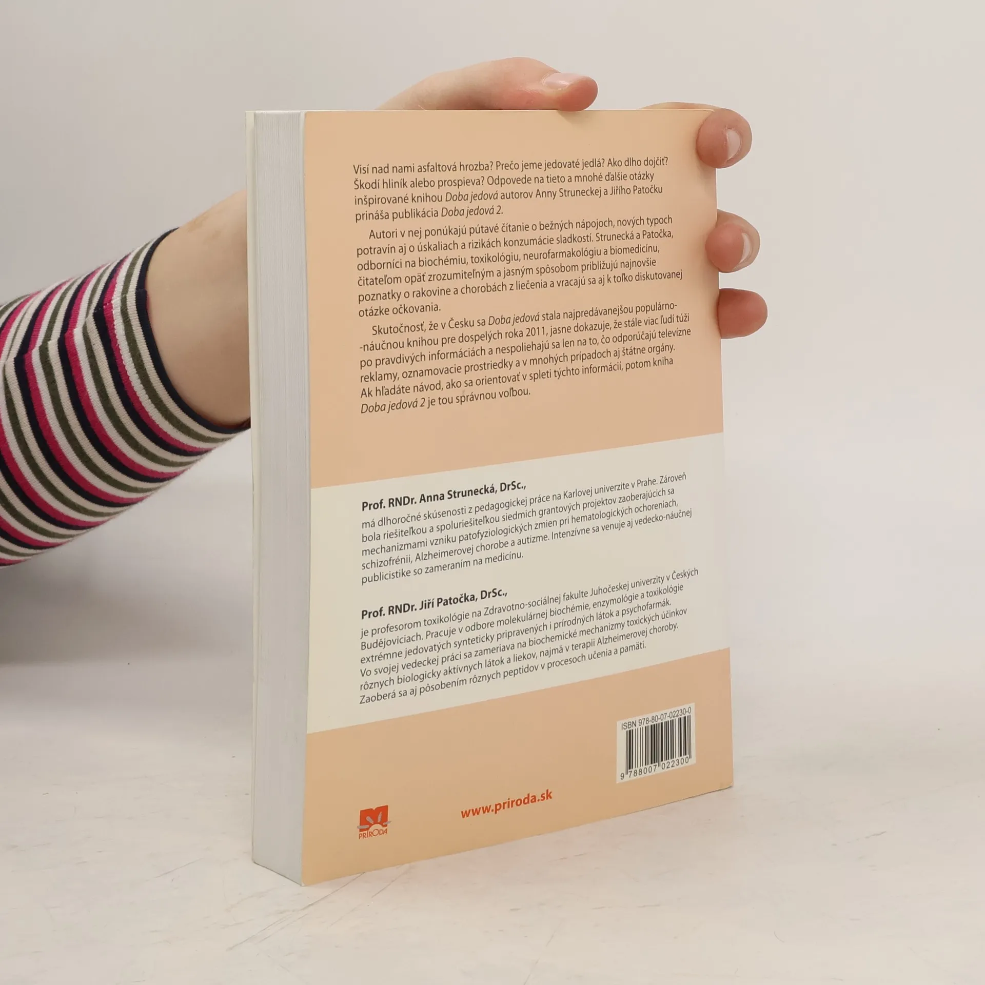 Visí nad nami azbestová hrozba? Prečo jeme jedovaté jedlá? Ako dlho dojčiť? Škodí hliník nášmu zdraviu alebo prospieva? Odpovede na tieto a mnohé ďalšie otázky inšpirované knihou Doba jedová autorov prof. Anny Struneckej a prof. Jiřího Patočku prináša aktualizovaná publikácia Doba jedová 2, ktorá ponúka pútavé čítanie o bežných nápojoch, nových typoch potravín aj o úskaliach a rizikách konzumácie sladkostí. Autori, odborníci na biochémiu, toxikológiu, neurofarmakológiu a biomedicínu, čitateľom zrozumiteľným a jasným spôsobom približujú najnovšie poznatky o rakovine a o chorobách z liečenia a vracajú sa aj k toľko diskutovanej otázke očkovania. Po pravdivých informáciách túži stále viac ľudí, ktorí sa už nespoliehajú len na to, čo nám odporúčajú televízne reklamy, tlač a v mnohých prípadoch aj štátne orgány. Ak patríte k nim a hľadáte návod, ako sa orientovať v spleti rôznych a často si aj odporujúcich informácií, potom kniha Doba jedová 2 je pre vás tou správnou voľbou. Z českého originálu Doba jedová 2 (vydavateľstvo Triton, Praha 2012) preložila PhDr. Zora Špačková.