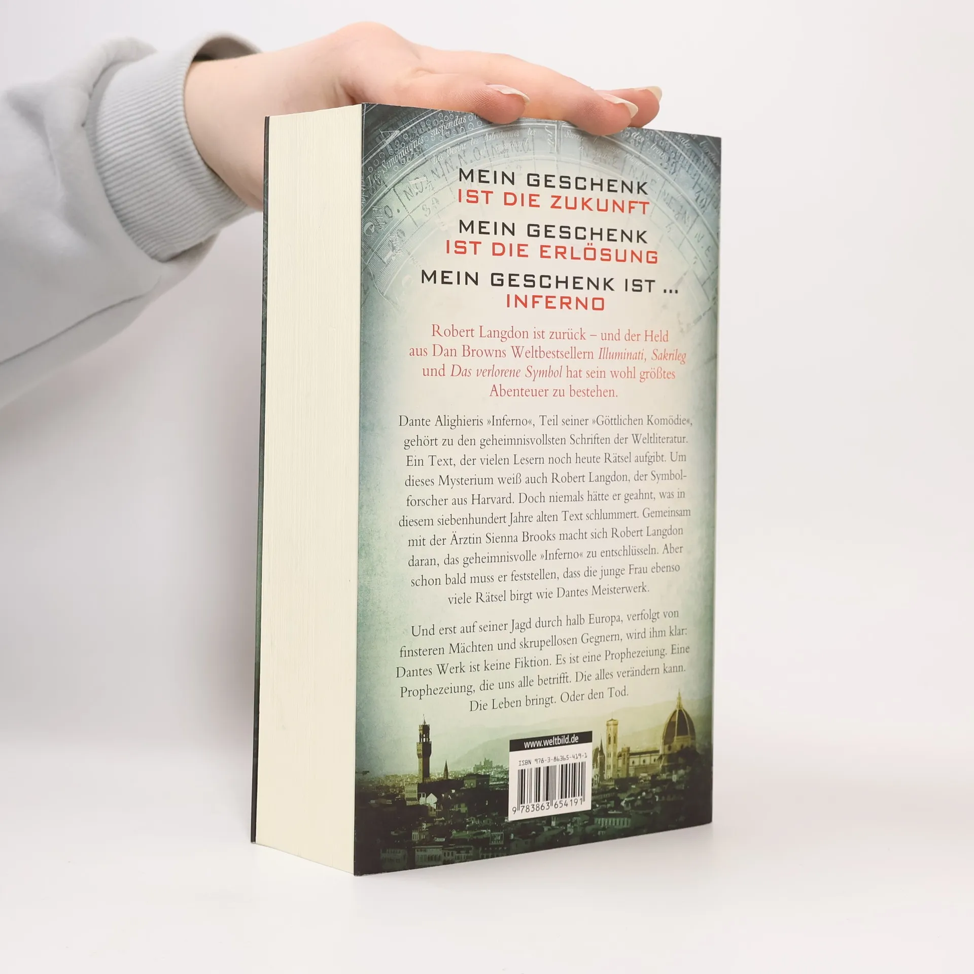 Robert Langdon ist zurück ... und hat sein wohl größtes Abenteuer zu bestehen. Dante Alighieris Inferno, Teil seiner Göttlichen Komödie, gehört zu den geheimnisvollsten Schriften der Weltliteratur. Ein Text, der vielen Lesern noch heute Rätsel aufgibt. Um dieses Mysterium weiß auch Robert Langdon, der Symbolforscher aus Harvard. Doch niemals hätte er geahnt, was in diesem siebenhundert Jahre alten Text schlummert. Und erst auf seiner Jagd durch halb Europa, verfolgt von finsteren Mächten und skrupellosen Gegnern, wird ihm klar: Dantes Werk ist keine Fiktion. Es ist eine Prophezeiung. Eine Prophezeiung, die uns alle betrifft. Die Leben bringt. Oder den Tod.