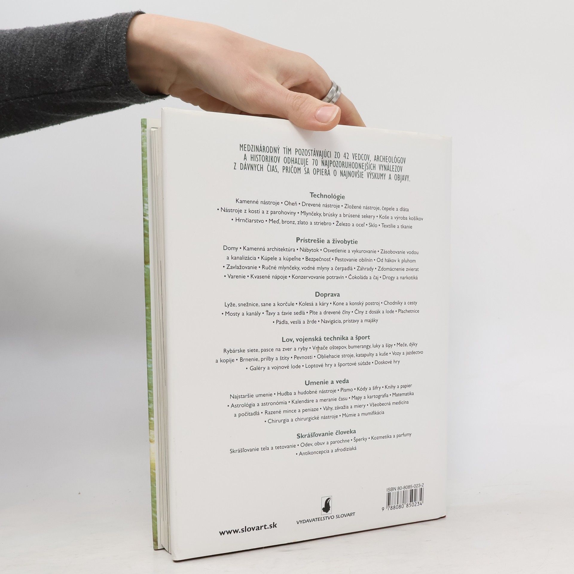 Kamenné sekerky, ihly s uškom, sedlá na ťavy, vozíky a antikoncepčné prípravky, minulosť dláždia pozoruhodné vynálezy. Niektoré sú celkom základné, iné zas neobvyklé alebo bizarné. Kniha Sedemdesiat veľkých vynálezov starovekého sveta nám otvorí oči, prevedie nás zlepšovacími návrhmi človeka od prvých nástrojov z neopracovaného kameňa, ktoré pred dva a pol miliónmi rokov používali naši dávni predkovia, až po raný stredovek. V knihe je veľa podnetných fotografií a názorných obrázkov, máp a plánikov. Je to jedinečný sprievodca tými najpozoruhodnejšími vynálezmi ľudstva a svedectvo o geniálnej vynachádzavosti aj schopnosti našich predkov využívať veci okolo seba, čo sú vlastnosti prospešné dodnes. Odpovedá aj na tieto otázky: Ako Rimania a iné národy vykurovali a zásobovali vodou svoje príbytky ? Ako varenie, konzervovanie a fermentácia ovplyvnili vývoj dávnovekej kuchyne ? Kedy sa objavili prvé cesty a kedy sa začali prvé dlhé námorné plavby ? Ako koleso a vozík zmenili život ľudí a zvýšili ich mobilitu ?