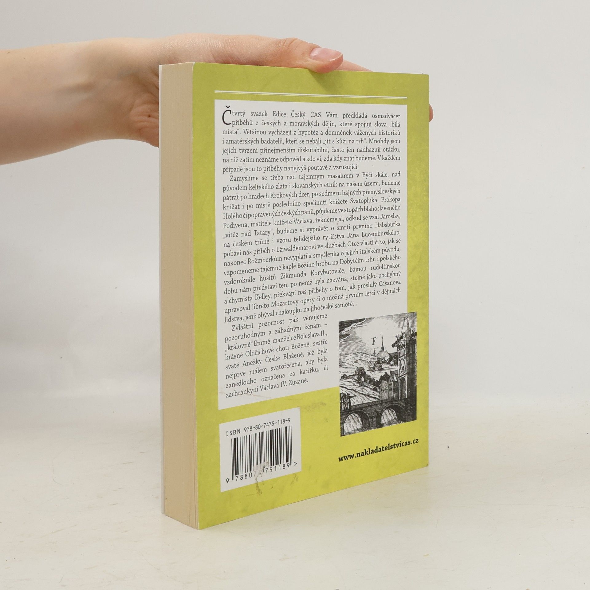 Čtvrtý svazek Edice Český ČAS Vám předkládá osmadvacet příběhů z českých a moravských dějin, které spojují slova „bílá místa“. Většinou vycházejí z hypotéz a domněnek vážených historiků i amatérských badatelů, kteří se nebáli „jít s kůží na trh“. Mnohdy jsou jejich tvrzení přinejmenším diskutabilní, často jen nadhazují otázku, na niž zatím neznáme odpověď a kdo ví, zda kdy znát budeme. V každém případě jsou to příběhy nanejvýš poutavé a vzrušující.