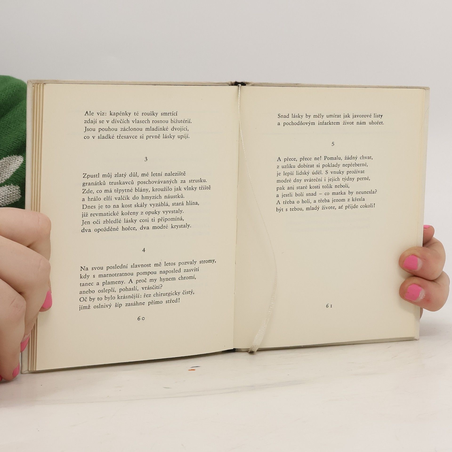 Verše z let 1957–1962. V nové sbírce se s pestrým motivickým repertoárem pojí jak pozoruhodná mnohotvárnost její noty, tak i nezřídka svěží obraznost, nadaná bohatstvím představ sytou smyslovou názorností. Sbírka převážně lyrických básní, ať už událostem, dojmům a zážitkům, které rozechvěly básnířčino nitro, nastavují zrcátka podobenství, či je jen prostě tlumočí.