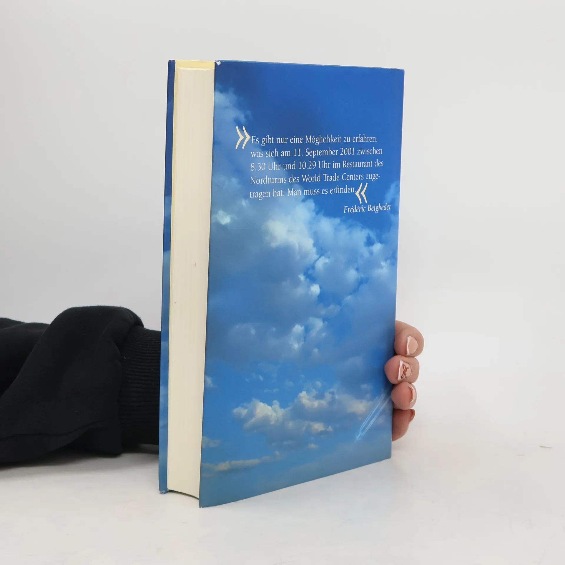 »Es gibt nur eine Möglichkeit, zu erfahren, was sich am 11. September 2001 zwischen 8.30 Uhr und 10.29 Uhr im Restaurant des Nordturms des World Trade Centers zugetragen hat: Man muß es erfinden.« Frédéric Beigbeder Beigbeder spürt dem Grauen anhand des Immobilienmaklers Carthew Yorston nach, der am 11. September 2001 um 08.30 Uhr mit seinen beiden Söhnen im Luxusrestaurant Windows of the World des World Trade Centers sitzt, bevor und während die beiden Passagierflugzeuge in die Zwillingstürme rasen.