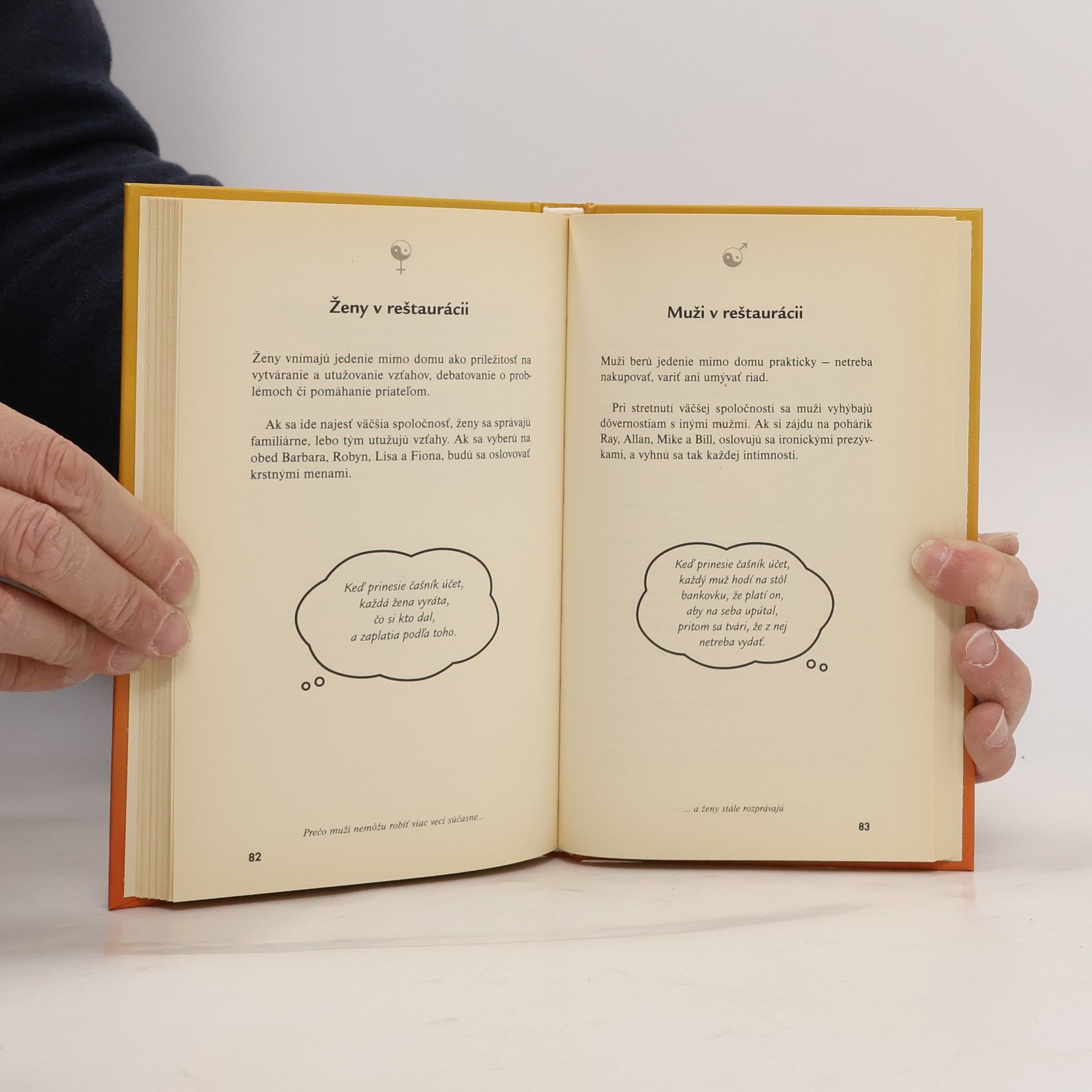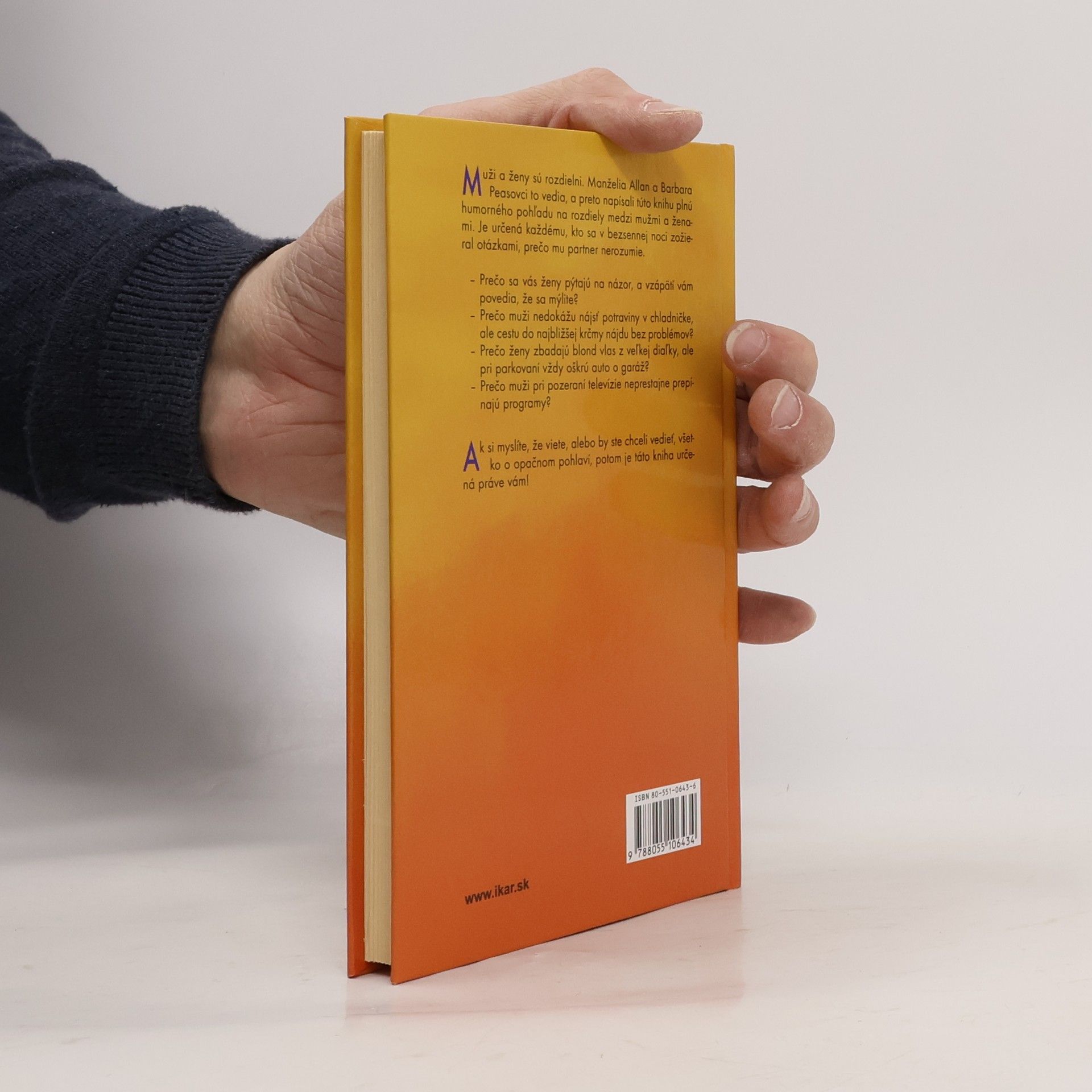 Muži a ženy sú rozdielni. Manželia Allan a Barbara Peasovci to vedia, a preto napísali túto knihu plnú humorného pohľadu na rozdiely medzi mužmi a ženami. Je určená každému, kto sa v bezsennej noci zožieral otázkami, prečo mu partner nerozumie. - Prečo sa vás ženy pýtajú na názor, a vzápätí vám povedia, že sa mýlite? - Prečo muži nedokážu nájsť potraviny v chladničke, ale cestu do najbližšej krčmy nájdu bez problémov? - Prečo ženy zbadajú blond vlas z veľkej diaľky, ale pri parkovaní vždy oškrú auto o garáž? - Prečo muži pri pozeraní televízie neprestajne prepínajú programy? Ak si myslíte, že viete, alebo by ste chceli vedieť, všetko o opačnom pohlaví, potom je táto kniha určená práve vám!
