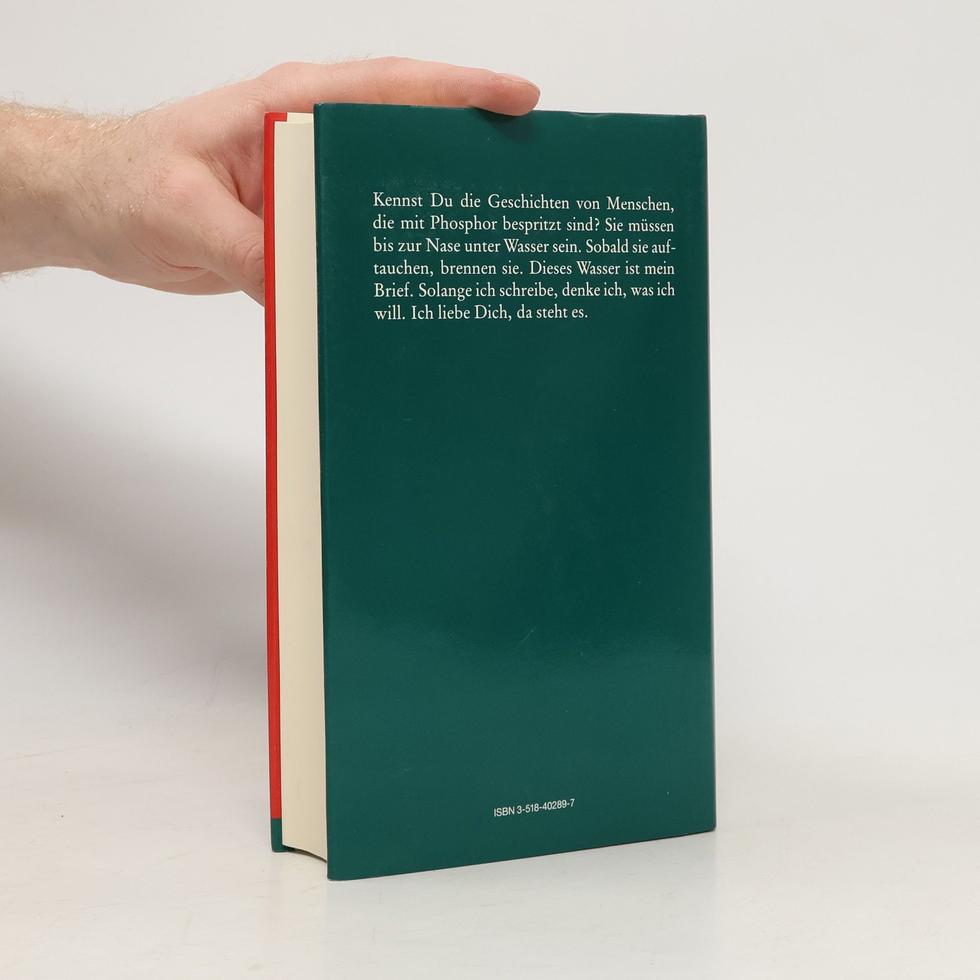 Kennst Du die Geschichte von Menschen, die mit Phosphor bespritzt sind? Sie müssen bis zur Nase unter Wasser sein. Sobald sie auftauchen, brennen sie. Dieses Wasser ist mein Brief. Solange ich schreibe, denke ich, was ich will. Ich liebe Dich, da steht es.