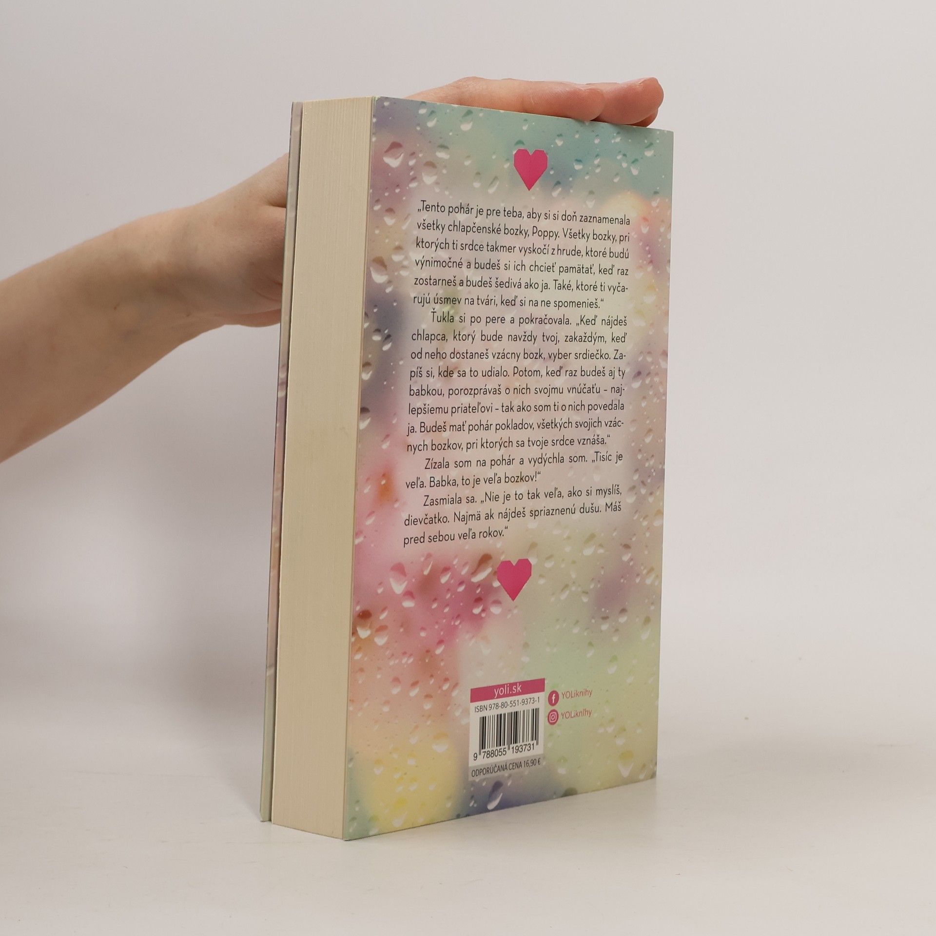 Možno sa zamilovali priveľmi mladí Rune pochádza z Nórska. Má päť rokov a nepáči sa mu, že sa musí s rodičmi presťahovať do Ameriky, kde jeho otec dostal prácu. Po príchode sa zoznámi s rovesníčkou Poppy a jeho život je hneď ružovejší. Rodí sa medzi nimi hlboká náklonnosť, každú voľnú chvíľu trávia spolu, je z nich nerozlučná dvojica. Poppy však nadovšetko miluje aj svoju babku, ktorá jej pred odchodom na večnosť daruje obyčajný zaváraninový pohár plný papierových srdiečok. Má si na ne zaznamenať tisíc najkrajších bozkov, ktoré v živote dostane. Prejde desať rokov a Rune sa s rodičmi vracia späť do Osla. S Poppy si sľúbia, že budú každý deň v kontakte. Ona sa však zakrátko odmlčí. Neodpovedá na maily, nedvíha telefón. Čo sa stalo? Oklamala ho? Našla si niekoho iného? Veď sa predsa ľúbili! Rune zatrpkne a zanevrie na celý svet. A keď po čase opäť prichádza do Ameriky, dozvedá sa pravdu. Kiežby bola iná. Z anglického originálu A Thousand Boy Kisses (Bloom Books, USA 2016) preložila Monika Srnková.