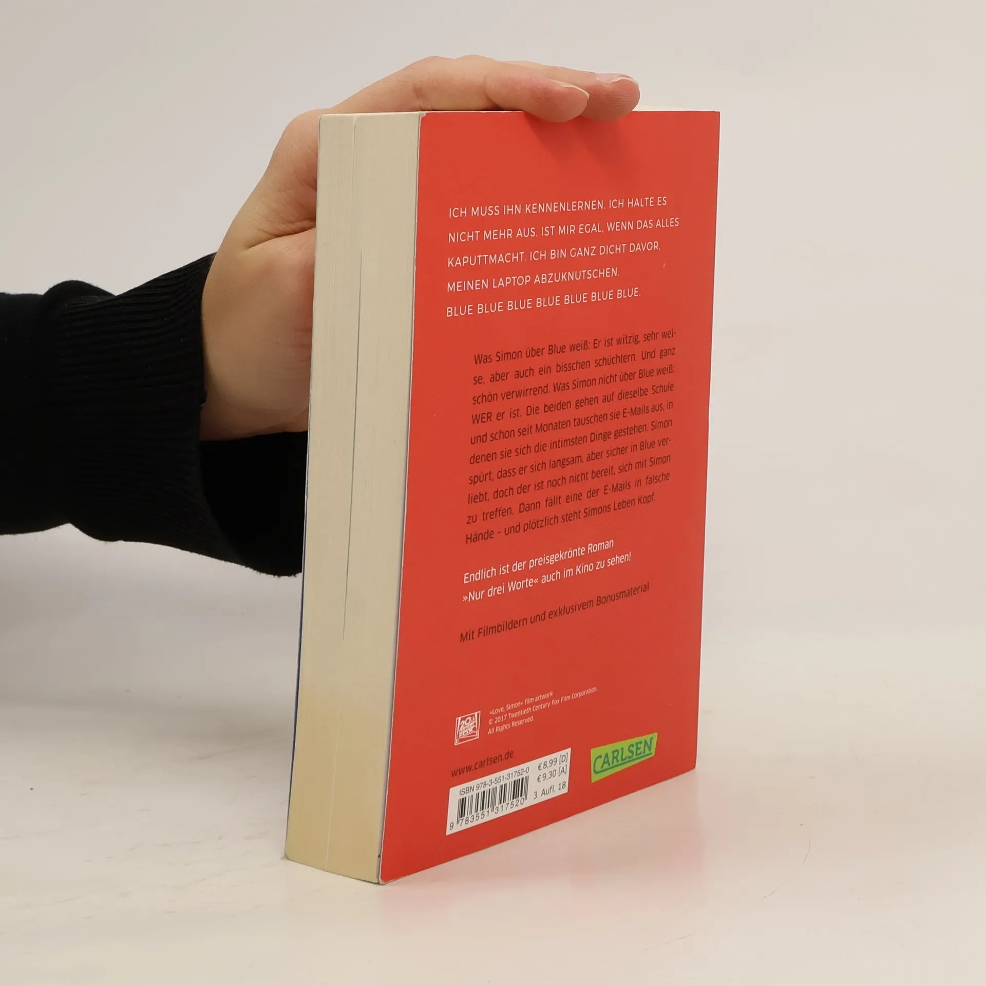 Gewinner des Deutschen Jugendliteraturpreises 2017! (Jugendjury) Jetzt ist der preisgekrönte Roman »Nur drei Worte« unter dem Titel »Love, Simon« auch im Kino zu sehen! In den Hauptrollen: Nick Robinson (Jurassic World) und Katherine Langford (Tote Mädchen lügen nicht). Was Simon über Blue weiß: Er ist witzig, sehr weise, aber auch ein bisschen schüchtern. Und ganz schön verwirrend. Was Simon nicht über Blue weiß: WER er ist. Die beiden gehen auf dieselbe Schule und schon seit Monaten tauschen sie E-Mails aus, in denen sie sich die intimsten Dinge gestehen. Simon spürt, dass er sich langsam, aber sicher in Blue verliebt, doch der ist noch nicht bereit, sich mit Simon zu treffen. Dann fällt eine der E-Mails in falsche Hände – und plötzlich steht Simons Leben Kopf. Die schönste Liebesgeschichte aller Zeiten – Herzchenaugen und Dauergrinsen garantiert! »Dieses Buch hat mir ein breites Grinsen aufs Gesicht gezaubert. Mein Herz ist zehnmal größer geworden. Ich bin wahrscheinlich ein besserer, gesünderer und glücklicherer Mensch, seitdem ich es gelesen habe.« (Leserstimme auf Goodreads)