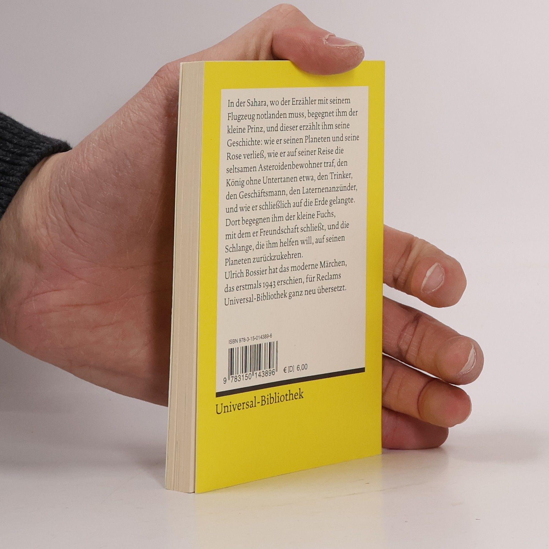 Das Original – jetzt vollständig in Farbe! In der Sahara, wo der Erzähler mit seinem Flugzeug notlanden muss, begegnet ihm der kleine Prinz, und dieser erzählt ihm seine Geschichte: wie er seinen Planeten und seine Rose verließ, wie er auf seiner Reise die seltsamen Asteroidenbewohner traf, den König ohne Untertanen etwa, den Trinker, den Geschäftsmann, den Laternenanzünder, und wie er schließlich auf die Erde gelangte. Dort begegnen ihm der kleine Fuchs, mit dem er Freundschaft schließt, und die Schlange, die ihm helfen will, auf seinen Planeten zurückzukehren. Ulrich Bossier hat das moderne Märchen, das erstmals 1943 erschien, für Reclams Universal-Bibliothek ganz neu übersetzt. Mit den bekannten Illustrationen des Verfassers – jetzt vollständig in Farbe.