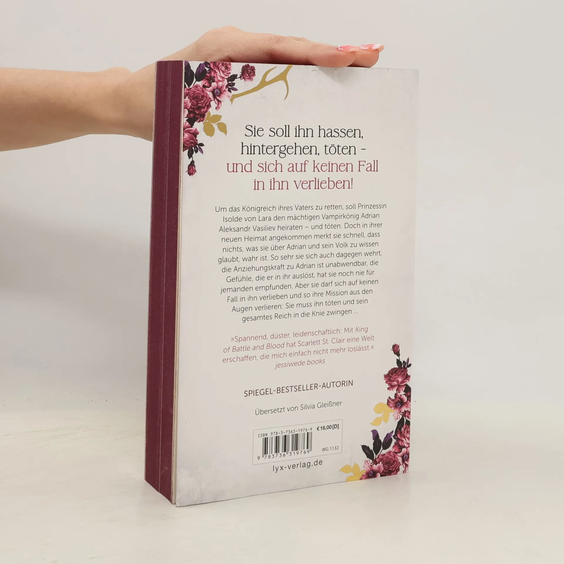 Sie soll ihn hassen, hintergehen, töten - und sich auf keinen Fall in ihn verlieben! Um das Königreich ihres Vaters zu retten, soll Prinzessin Isolde von Lara den mächtigen Vampirkönig Adrian Aleksandr Vasiliev heiraten - und töten. Doch in ihrer neuen Heimat angekommen merkt sie schnell, dass nichts, was sie über Adrian und sein Volk zu wissen glaubt, wahr ist. So sehr sie sich auch dagegen wehrt, die Anziehungskraft zu Adrian ist unabwendbar, die Gefühle, die er in ihr auslöst, hat sie noch nie für jemanden empfunden. Aber sie darf sich auf keinen Fall in ihn verlieben und so ihre Mission aus den Augen verlieren: Sie muss ihn töten und sein gesamtes Reich in die Knie zwingen ... »Spannend, düster, leidenschaftlich: Mit KING OF BATTLE AND BLOOD hat Scarlett St. Clair eine Welt erschaffen, die mich einfach nicht mehr loslässt.« JESSIWEDE. BOOKS Der Auftakt der fesselnden KING-OF-BATTLE-AND-BLOOD-Trilogie von Bestseller-Autorin Scarlett St. Clair Dieses Buch gibt es in zwei Versionen: mit und ohne Farbschnitt. Sobald die Farbschnitt-Ausgabe ausverkauft ist, liefern wir die Ausgabe ohne Farbschnitt aus