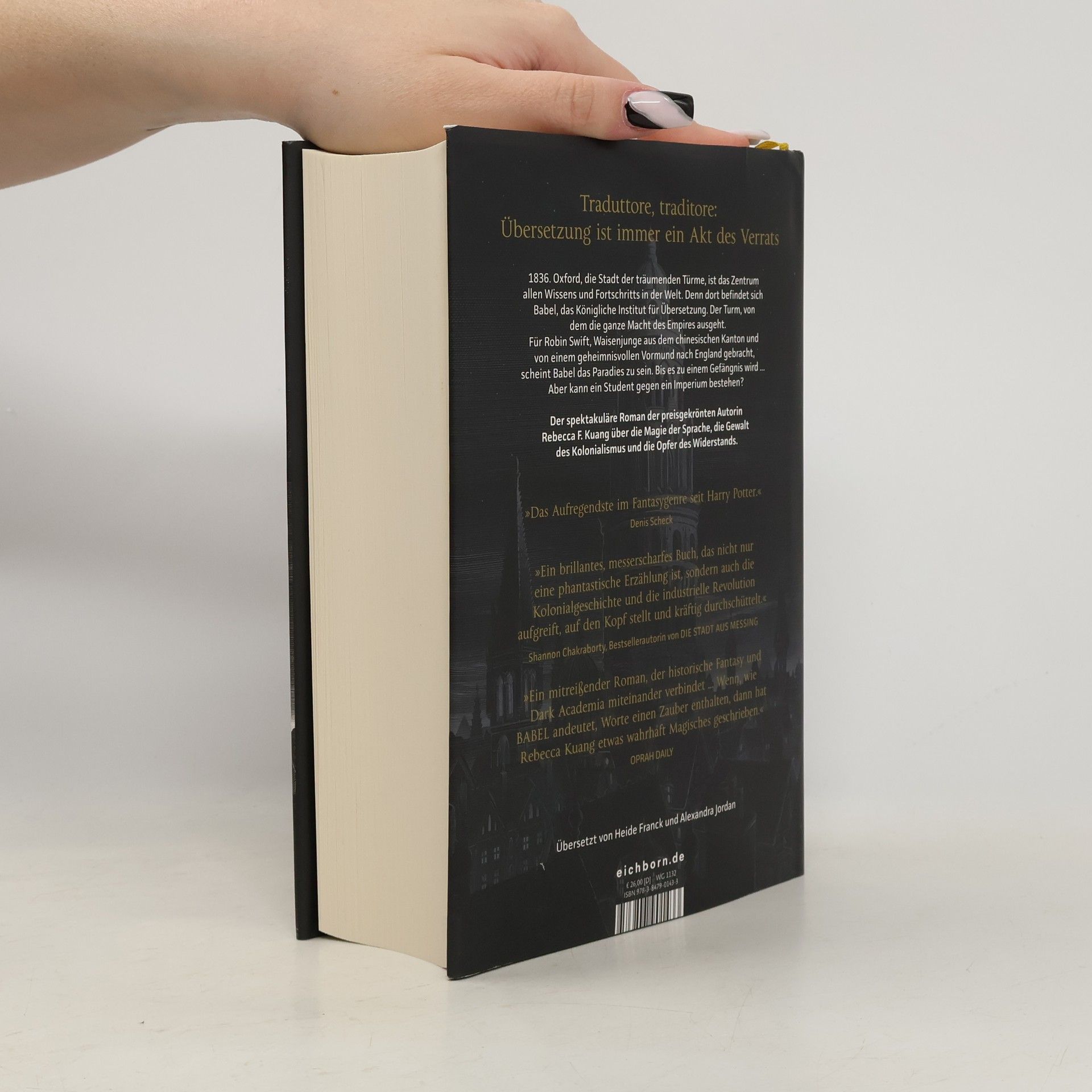 1828: Robin Swift, ein Waisenkind aus China, wird von Professor Lovell nach London gebracht, nachdem ein Cholera-Ausbruch seine Heimat verwüstet hat. Dort lernt er jahrelang Latein, Altgriechisch und Chinesisch, um am Königlichen Institut für Übersetzung in Oxford, auch bekannt als Babel, studieren zu können. Oxford ist das Zentrum des Wissens und verkörpert die Macht des britischen Empires. Neben der Übersetzung wird hier auch Magie gelehrt; das Silberwerk ermöglicht es, verlorene Bedeutungen durch verzauberte Silberbarren zu manifestieren, was dem Empire enormen Einfluss verschafft. Für Robin ist Oxford ein Traumort, der dem Streben nach Wissen gewidmet ist. Doch er erkennt, dass Wissen auch Macht bedeutet, und als chinesischer Junge wird ihm klar, dass es einen Verrat an seinem Heimatland bedeutet, Babel zu dienen. Während seines Studiums steht Robin zwischen Babel und dem geheimen Hermes-Bund, der die imperialen Ambitionen stoppen will. Als Großbritannien einen ungerechten Krieg gegen China um Silber und Opium führt, muss Robin eine Entscheidung treffen. Kann ein Student gegen ein Imperium bestehen? Ein fesselnder Roman über die Magie der Sprache, den Kolonialismus und den Widerstand.