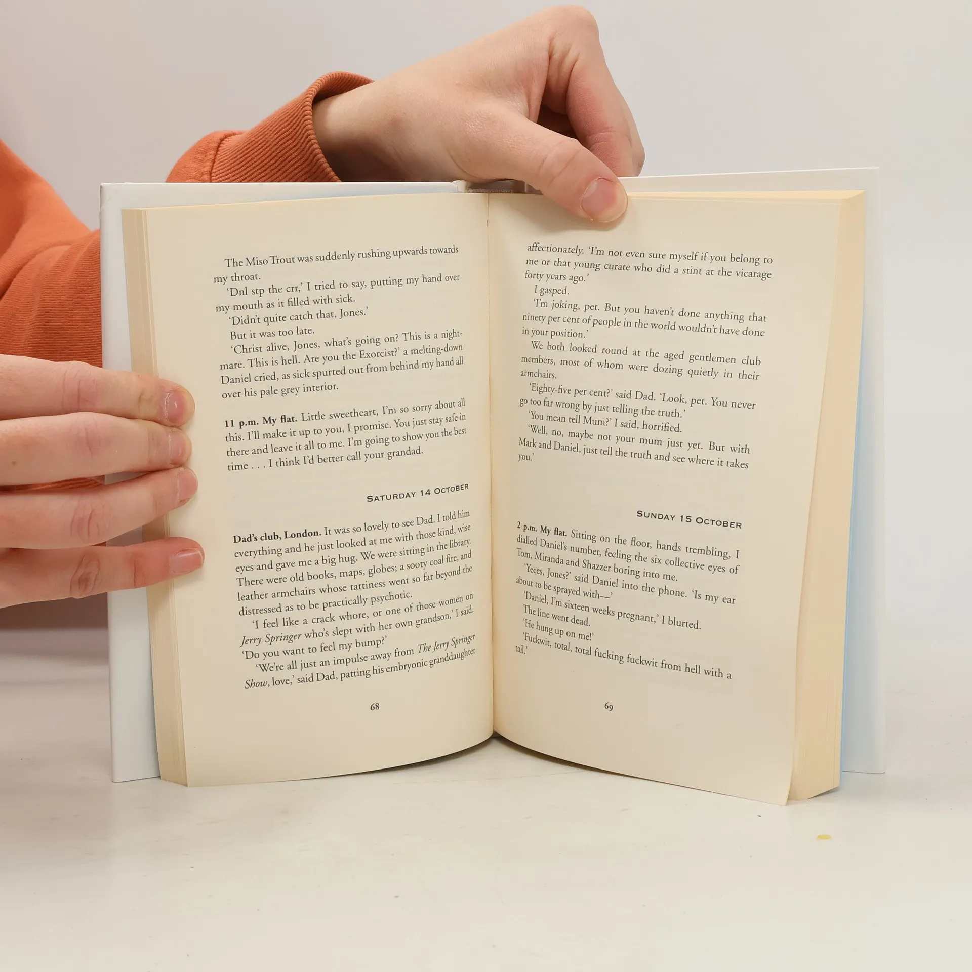 ** The new Bridget Jones novel ** 8.45 P.M. Realise there have been so many times in my life when have fantasised about going to a scan with Mark or Daniel: just not both at the same time. Before motherhood, before marriage, Bridget, with biological clock ticking very, very loudly, finds herself unexpectedly pregnant at the eleventh hour: a joyful pregnancy which is dominated, however, by a crucial but terribly awkward question - who is the father? Mark Darcy: honourable, decent, notable human rights lawyer? Or Daniel Cleaver: charming, witty, notable fuckwit? 9.45 P.M. It's like they're two halves of the perfect man, who'll spend the rest of their lives each wanting to outdo the other one. And now it's all enacting itself in my stomach. In this gloriously funny, touching story of baby-deadline panic, maternal bliss, and social, professional, technological, culinary and childbirth chaos, Bridget Jones - global phenomenon and the world's favourite Singleton - is back with a bump.