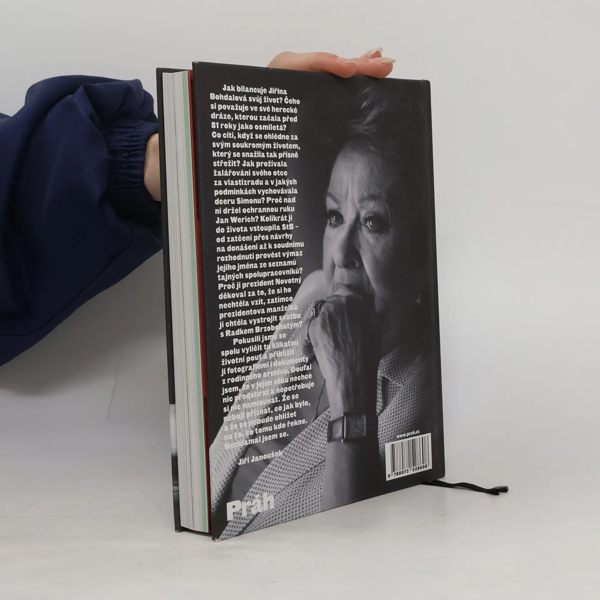 Knižní událost podzimu – Jiřina Bohdalová téměř v devadesáti letech vypráví o svém životě. Poprvé knižně. Fotografie z osobního archivu. Jak Jiřina Bohdalová bilancuje svůj život? Čeho si považuje ve své herecké dráze, kterou začala před 81 lety jako osmiletá? Co cítí, když se ohlédne za svým soukromým životem, který se snažila tak přísně střežit? Jak prožívala žalářování otce za vlastizradu a v jakých podmínkách vychovávala dceru Simonu? Proč nad ní držel ochrannou ruku Jan Werich? Kolikrát jí do života vstoupila StB – od zatčení přes návrhy na donášení až k soudnímu rozhodnuté provést výmaz jejího jména ze seznamů spolupracovníků? Proč jí prezident Novotný děkoval za to, že si ho nevzala, zatímco prezidentova manželka jí chtěla vystrojit svatbu s Radkem Brzobohatým? Jiří Janoušek ke spolupráci s Jiřinou Bohdalovou říká: „Pokusili jsme se spolu vylíčit tu klikatou životní pouť a přiblížit ji fotografiemi i dokumenty z rodinného archivu. Doufal jsem, že v jejím věku nechce nic předstírat a nepotřebuje si nic namlouvat. Že se nebojí přiznat, co jak bylo, a že se nebude ohlížet na to, co tomu kdo řekne. Nezklamal jsem se.“