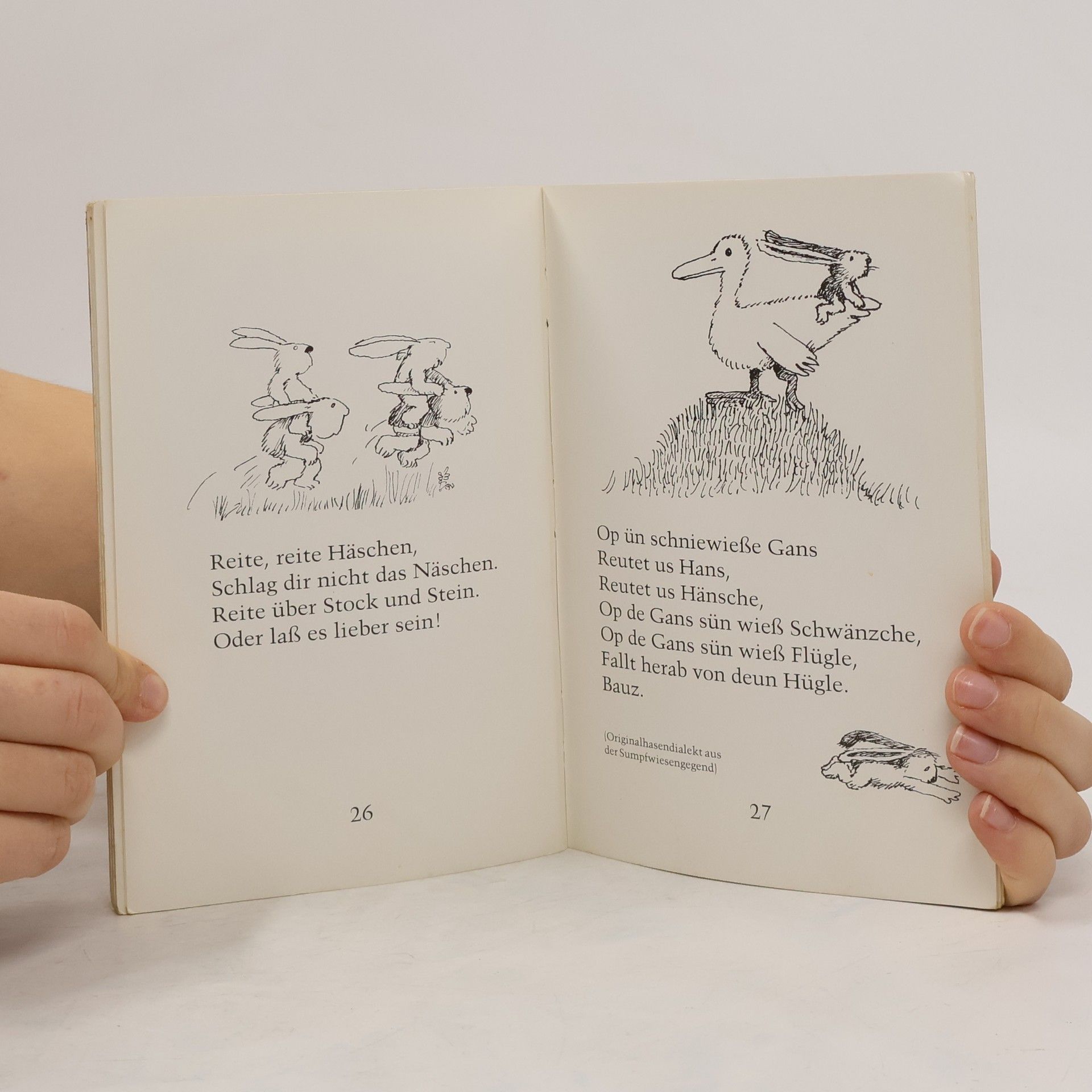 Reite, reite, Häschen, Schlag dir nicht das Näschen. Reite über Stock und Stein. Oder lass es lieber sein! Alte und neue Haseleien, ausgedacht, gesammelt, erzählt und gemalt von Janosch.