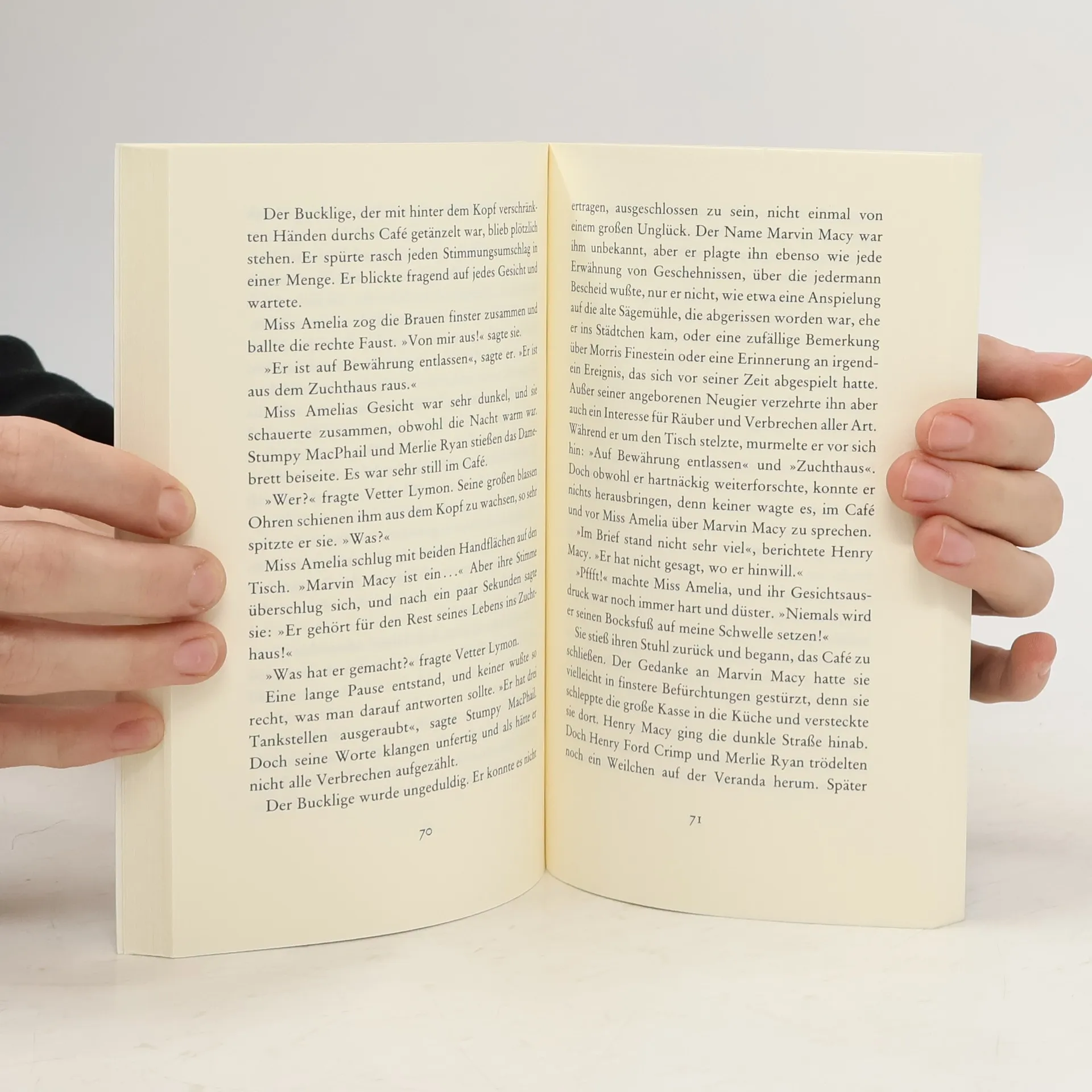 Miss Amelias Café ist die einzige Vergnügungsstätte weit und breit. Dort verkauft die unabhängige und starke Frau ihren selbstgebrannten Schnaps, und dort lebt sie mit Vetter Lymon, einem kleinen buckligen Mann, der gar nicht ihr Vetter ist. Dann jedoch kehrt ihr ehemaliger Mann in die Stadt zurück. - Eine tragische Dreiecksgeschichte aus den amerikanischen Südstaaten über die im Leben ewig zu kurz Kommenden, über Sehnsucht, Verrat, bittere Enttäuschung und kurzes Glück.