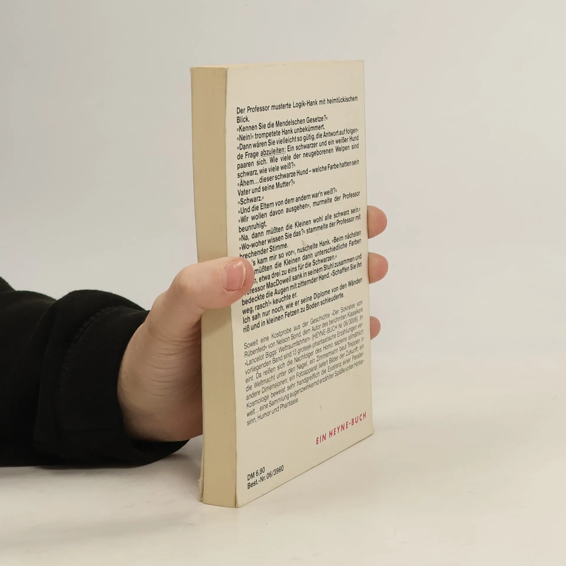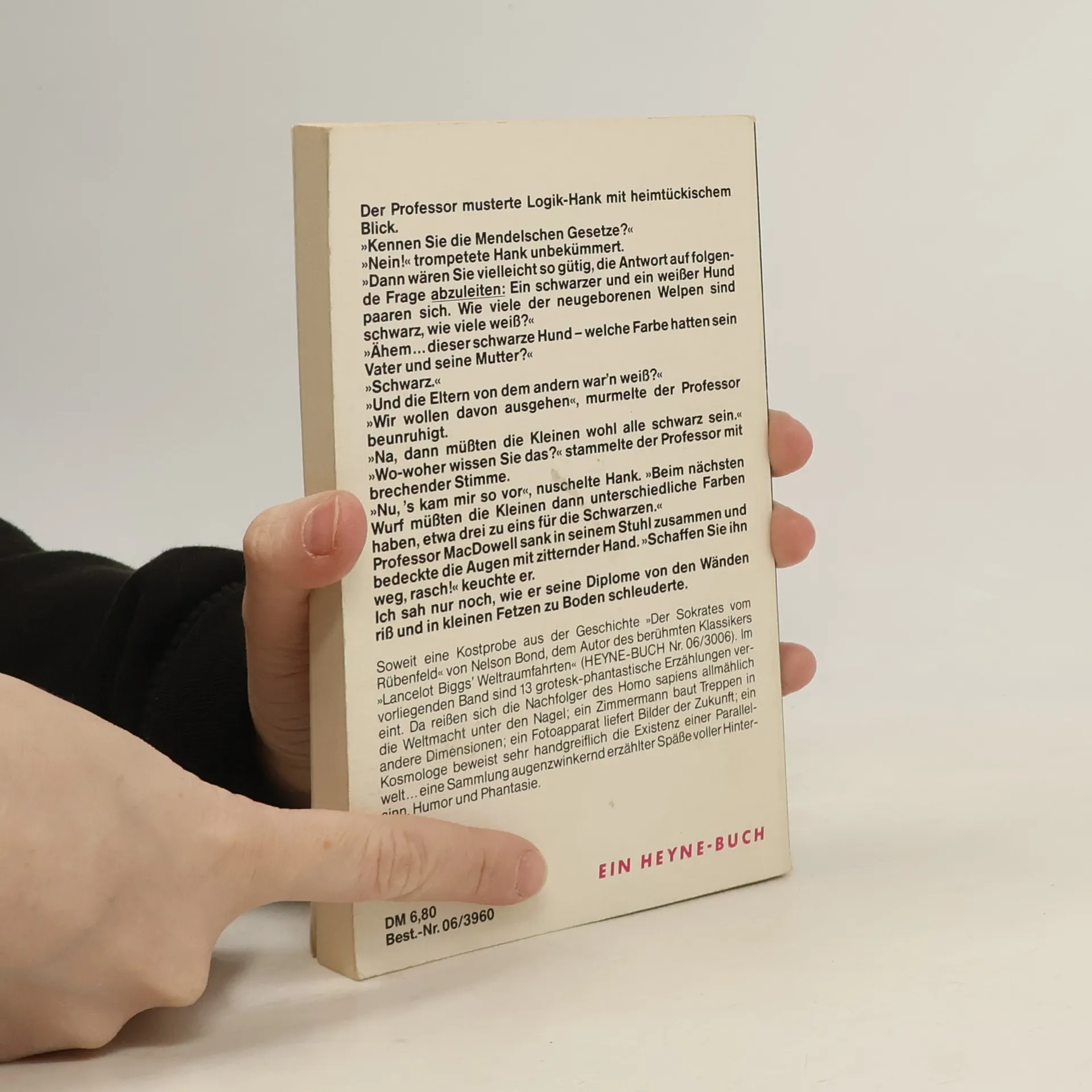 Der Professor musterte Logik-Hank mit heimtückischem Blick. »Kennen Sie die Mendelschen Gesetze?« »Nein!« trompetete Hank unbekümmert.»Dann wären Sie vielleicht so gütig, die Antwort auf folgende Frage abzuleiten: Ein schwarzer und ein weißer Hund paaren sich. Wie viele der neugeborenen Welpen sind schwarz, wie viele weiß?« »Ähem ... dieser schwarze Hund - welche Farbe hatten sein Vater und seine Mutter?« »Schwarz.« »Und die Eltern von dem andern war'n weiß?« »Wir wollen davon ausgehen«, murmelte der Professor beunruhigt. »Na, dann müssten die Kleinen wohl alle schwarz sein.« »Wo-woher wissen Sie das?« stammelte der Professor mit brechender Stimme. »Nu, 's kam mir so vor«, nuschelte Hank. »Beim nächsten Wurf müssten die Kleinen dann unterschiedliche Farben haben, etwa drei zu eins für die Schwarzen.« Professor MacDowell sank in seinem Stuhl zusammen und bedeckte die Augen mit zitternder Hand. »Schaffen Sie ihn weg, rasch!« keuchte er. Ich sah nur noch, wie er seine Diplome von den Wänden riss und in kleinen Fetzen zu Boden schleuderte.