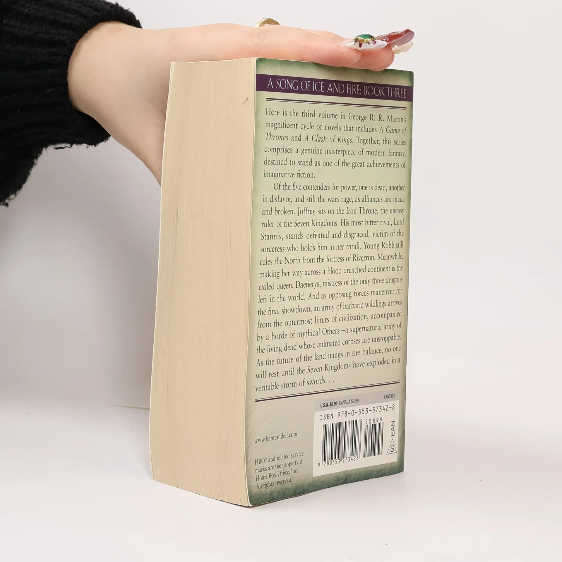 La 4ème de couverture indique : Of the five contenders for power, one is dead, another in disfavor, and still the wars rage as violently as ever, as alliances are made and broken. Joffrey, of House Lannister, sits on the Iron Throne, the uneasy ruler of the land of the Seven Kingdoms. His most bitter rival, Lord Stannis, stands defeated and disgraced, the victim of the jealous sorceress who holds him in her evil thrall. But young Robb, of House Stark, still rules the North from the fortress of Riverrun. Robb plots against his despised Lannister enemies, even as they hold his sister hostage at King's Landing, the seat of the Iron Throne. Meanwhile, making her way across a blood-drenched continent is the exiled queen, Daenerys, mistress of the only three dragons still left in the world. But as opposing forces maneuver for the final titanic showdown, an army of barbaric wildlings arrives from the outermost line of civilization. In their vanguard is a horde of mythical Others--a supernatural army of the living dead whose animated corpses are unstoppable. As the future of the land hangs in the balance, no one will rest until the Seven Kingdoms have exploded in a veritable storm of swords