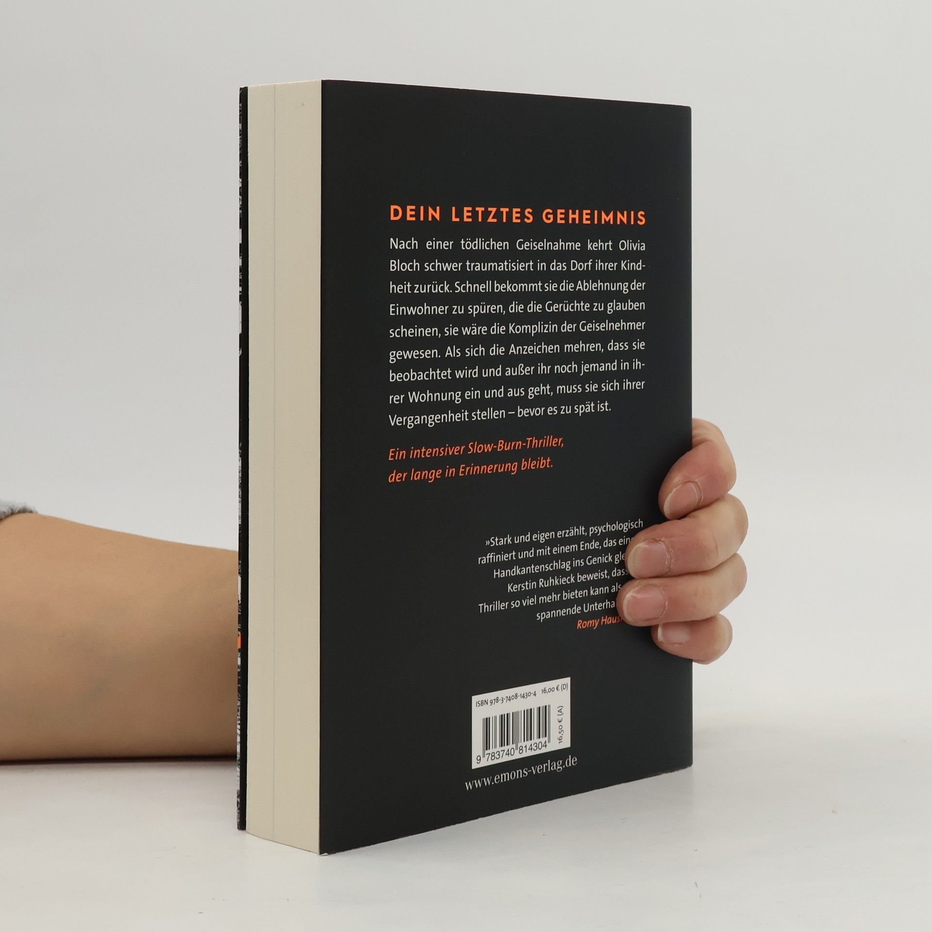 Ein intensiver Slow-Burn-Thriller, der lange in Erinnerung bleibt. Nach einer tödlichen Geiselnahme kehrt Olivia Bloch schwer traumatisiert in das Dorf ihrer Kindheit zurück. Schnell bekommt sie die Ablehnung der Einwohner zu spüren, die die Gerüchte zu glauben scheinen, sie wäre die Komplizin der Geiselnehmer gewesen. Als sich die Anzeichen mehren, dass sie beobachtet wird und außer ihr noch jemand in ihrer Wohnung ein und aus geht, muss sie sich ihrer Vergangenheit stellen – bevor es zu spät ist.