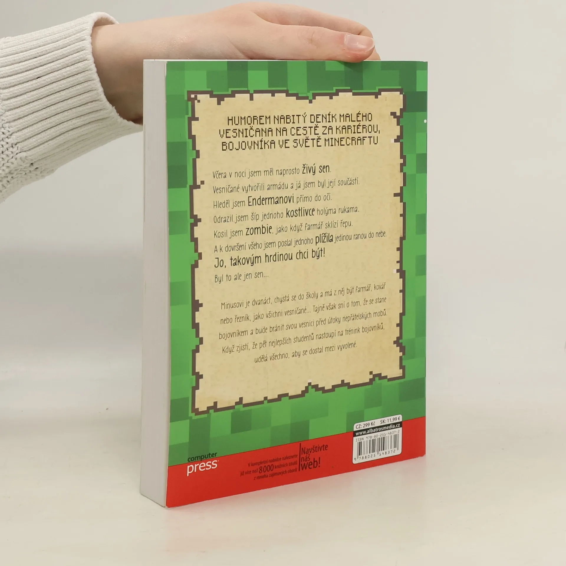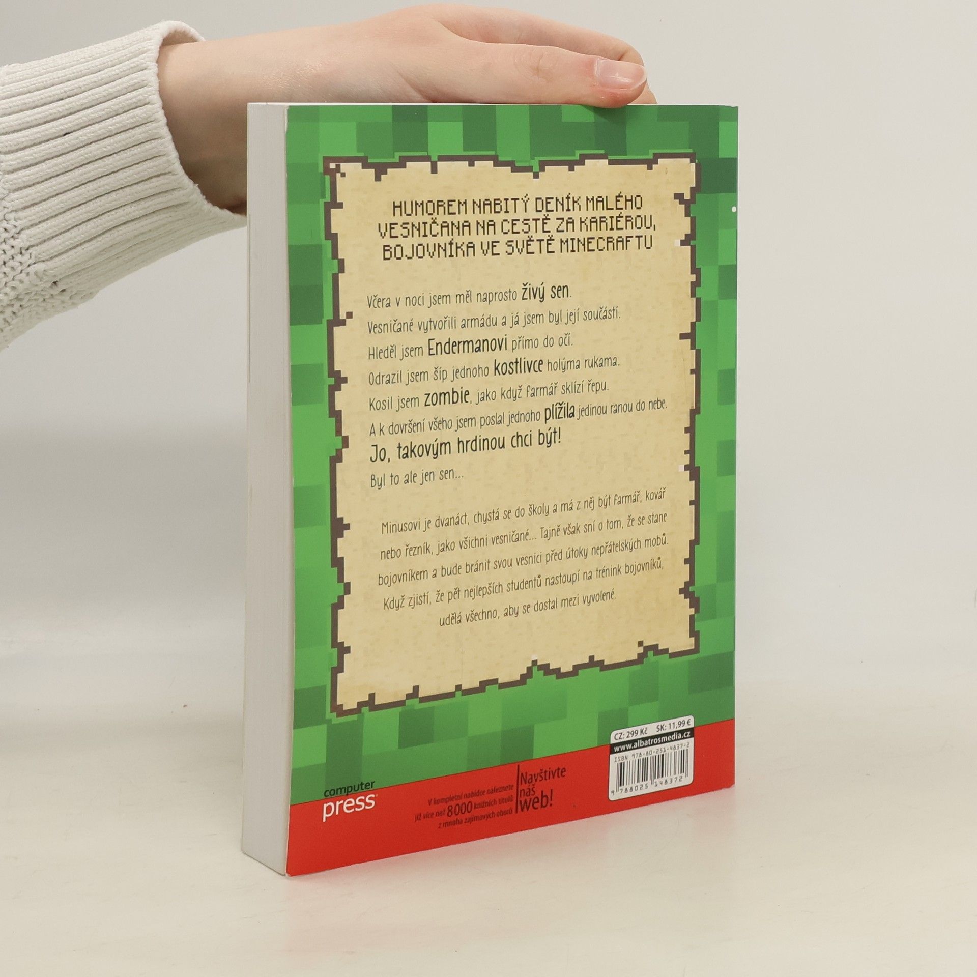 Humorem nabitý deník malého vesničana na cestě za kariérou bojovníka ve světě Minecraftu. Včera v noci jsem měl naprosto živý sen. Vesničané vytvořili armádu a já jsem byl její součástí. Hleděl jsem Endermanovi přímo do očí. Odrazil jsem šíp jednoho kostlivce holýma rukama. Kosil jsem zombie, jako když farmář sklízí řepu. A k dovršení všeho jsem poslal jednoho plížila jedinou ranou do nebe. Jo, takovým hrdinou chci být. Byl to ale jen sen... Minusovi je dvanáct, chystá se do školy a má z něj být farmář, kovář nebo řezník, jako všichni vesničané... Tajně však sní o tom, že se stane bojovníkem a bude bránit svou vesnici před útoky nepřátelských mobů. Když zjistí, že pět nejlepších studentů nastoupí na trénink bojovníků, udělá všechno, aby se dostal mezi vyvolené. Přeloženo z francouzské verze anglického originálu.