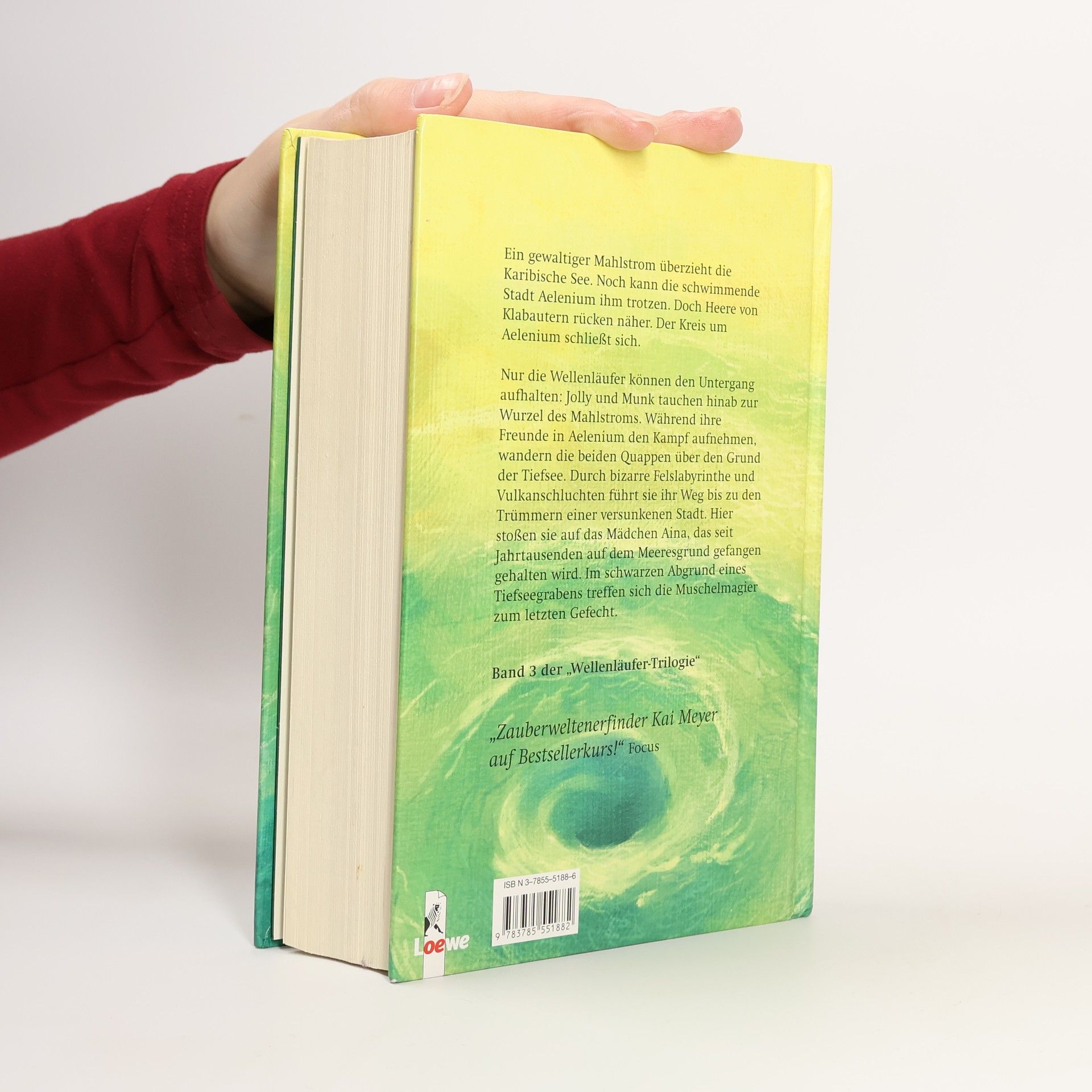 Band 3 der WellenläuferTrilogie (vgl. zuletzt BA 4/04) beginnt mit dem letzten Tag von Jolly in der Seestadt Aelenium. Sie verabschiedet sich vom verpuppten herxhermetischen Holzwurm, der noch eine besondere Verwandlung vor sich hat. Sie und Munk haben sich so weit vertragen, dass sie gemeinsam den Weg zum Mahlstrohm aufnehmen. Griffin hingegen wird von seinem Wal zur Seestadt gebracht und kann dort seinen Freunden helfen. Das ist auch nötig, denn eine unerbittliche Schlacht um Aelenium beginnt. Die fürchterlichen Klabauterheere werden zurückgeschlagen, als jedoch noch die KannibalenPiraten mit Kapitän Tyrone kommen, haben die Menschen in der Seestadt keine Kraft mehr. Jolly und Munk treffen am Meeresgrund eine mysteriöse Quappe. Diese Aina gewinnt Macht über Munk und kann Jolly in einem Klabauterberg gefangensetzen. Jolly ist auf sich allein gestellt und sucht den Weg in die Freiheit ... Furioses Finale der Trilogie mit magischmythologischer Symbolik, ein buntes Spektakel mit vielen Spannungsmomenten: Empfohlen, auch für junge Erwachsene.. Jolly und Munk müssen gemäß ihrer Bestimmung ihren Auftrag erfüllen und machen sich auf den Weg zum Mahlstrohm. Während sie dort überraschende Begegnungen haben, entwickelt sich um Aelenium eine fürchterliche Seeschlacht. Ab 13.