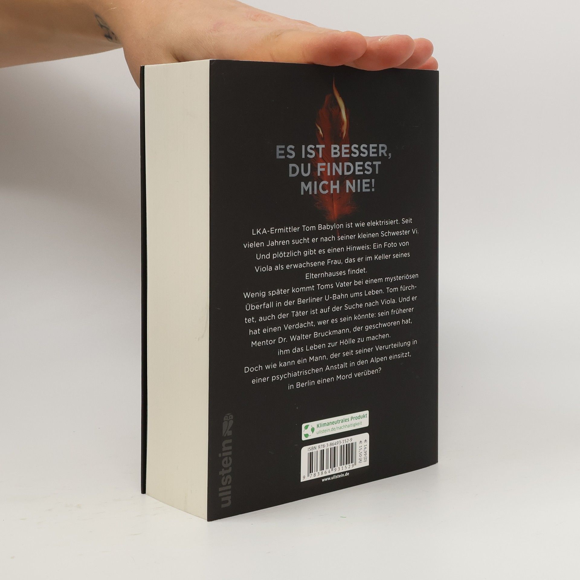 Es ist besser, du findest mich nieLKA-Ermittler Tom Babylon ist auf der Suche nach seiner kleinen Schwester „Vi“, die 1998 spurlos verschwand. Jetzt gibt es endlich einen Hinweis: Ein aktuelles Foto von Viola, versteckt im Keller seines Vaters. Bei einem mysteriösen Überfall in der Berliner U-Bahn wenig später kommt sein Vater ums Leben. Babylon ist sich sicher, auch der Täter ist auf der Suche nach Viola. Und er glaubt zu wissen, wer dahintersteckt: sein früherer Mentor Dr. Walter Bruckmann, der geschworen hat, ihm das Leben zur Hölle zu machen. Doch wie kann ein Mann, der seit seiner Verurteilung in einer Psychiatrischen Anstalt in den Alpen einsitzt, in Berlin einen Mord verüben?