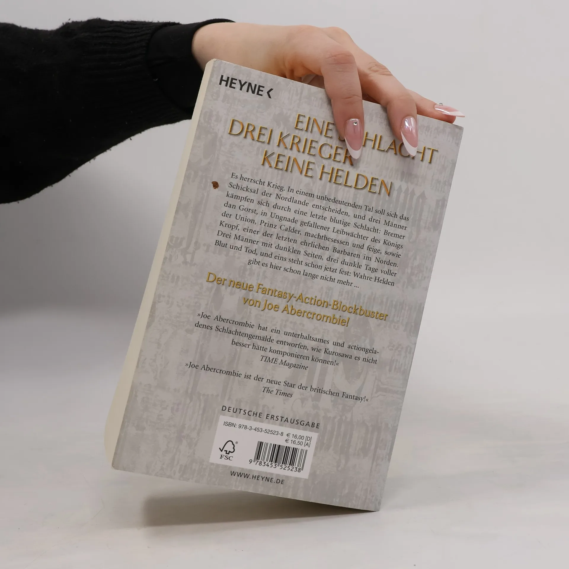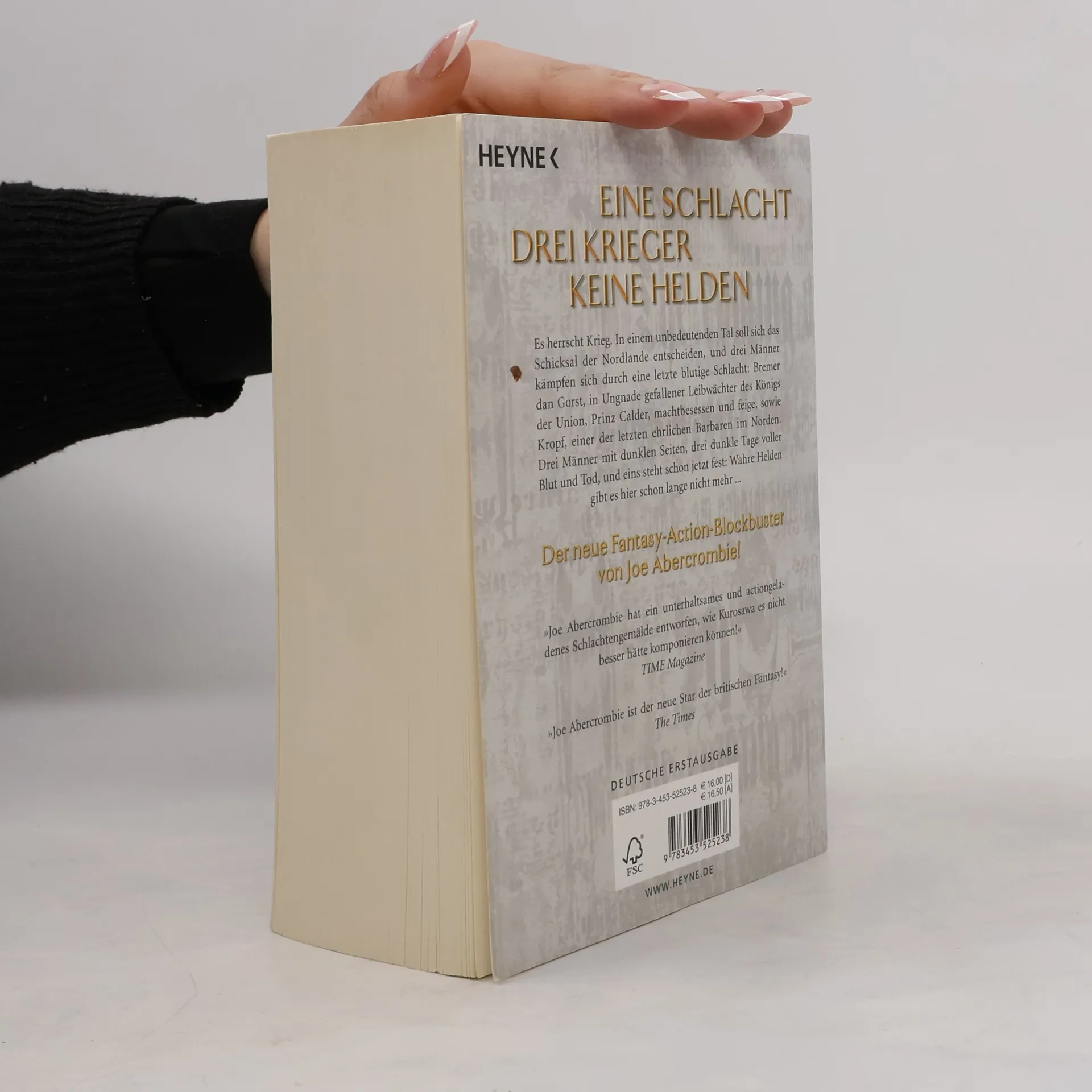 Drei Männer. Eine Schlacht. Keine Helden. Es herrscht Krieg. In einem unbedeutenden Tal entscheidet sich das Schicksal der Nordlande, und drei Männer kämpfen sich durch eine dreitägige, blutige Schlacht: Bremer dan Gorst, in Ungnade gefallener Leibwächter des Königs der Union, Prinz Calder, machtbesessen und feige, sowie Curnden Craw, einer der letzten ehrlichen Barbaren. Drei Männer mit dunklen Seiten, drei noch finsterere Tage voller Blut und Tod, und eines steht von Beginn an fest: Helden gibt es hier schon lange nicht mehr…