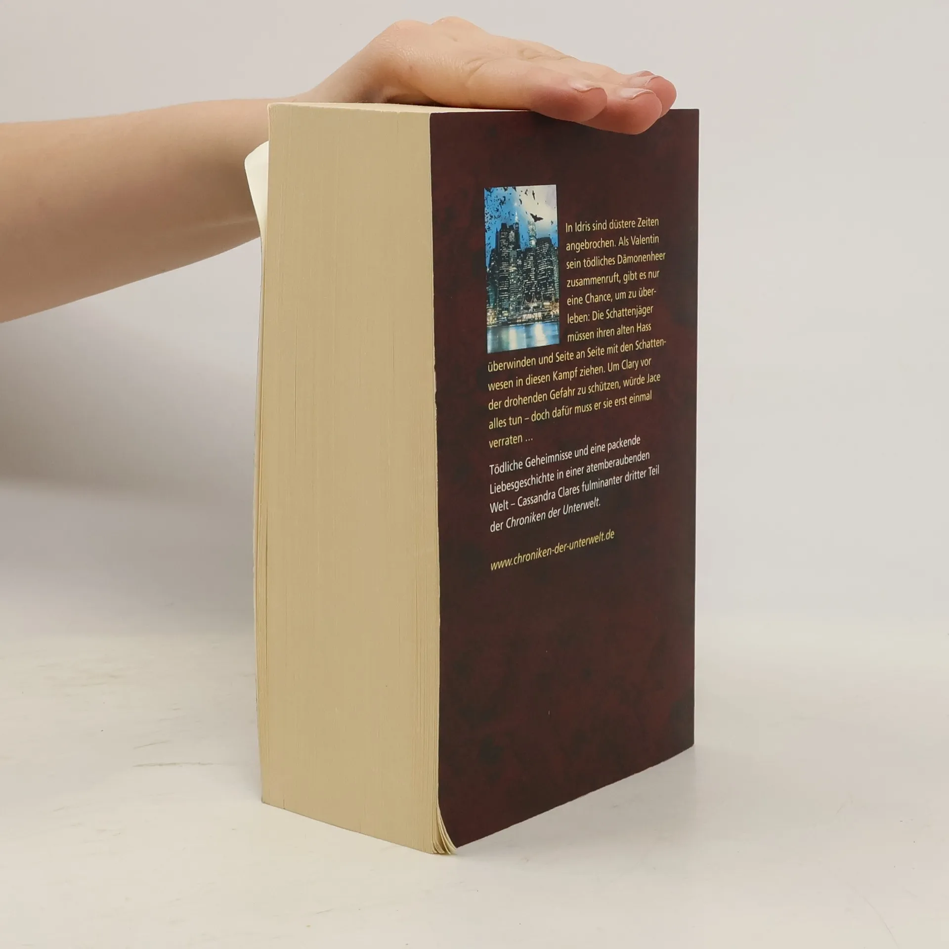 Um das Leben ihrer Mutter zu retten, begibt sich die junge Schattenjägerin Clary auf eine gefährliche Mission. Heimlich macht sie sich auf in die Hauptstadt Idris. Damit bricht sie ein uraltes Gesetz – doch das ist bald nicht mehr ihr größtes Problem: Ein Dämonenheer droht Idris zu überrennen, und es gibt nur eine einzige Möglichkeit, um zu überleben: Die Schattenjäger müssen ihren tief verwurzelten Hass überwinden und Seite an Seite mit den Wesen der Unterwelt in den Kampf ziehen. Während die Lage sich zuspitzt, versuchen Clary und Jace zudem ihre komplizierte Beziehung zu klären – und müssen erfahren, wie hoch der Preis für Liebe und Verrat sein kann …