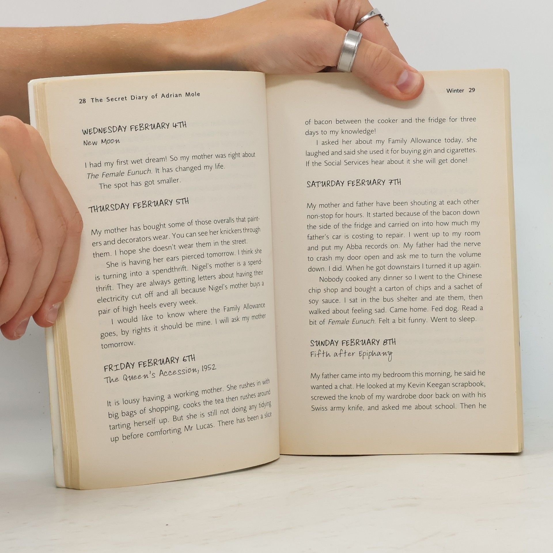 Friday January 2nd. I felt rotten today. It's my mother's fault for singing 'My Way' at two o'clock in the morning at the top of the stairs. Just my luck to have a mother like her. There is a chance my parents could be alcoholics. Next year I could be in a children's home.