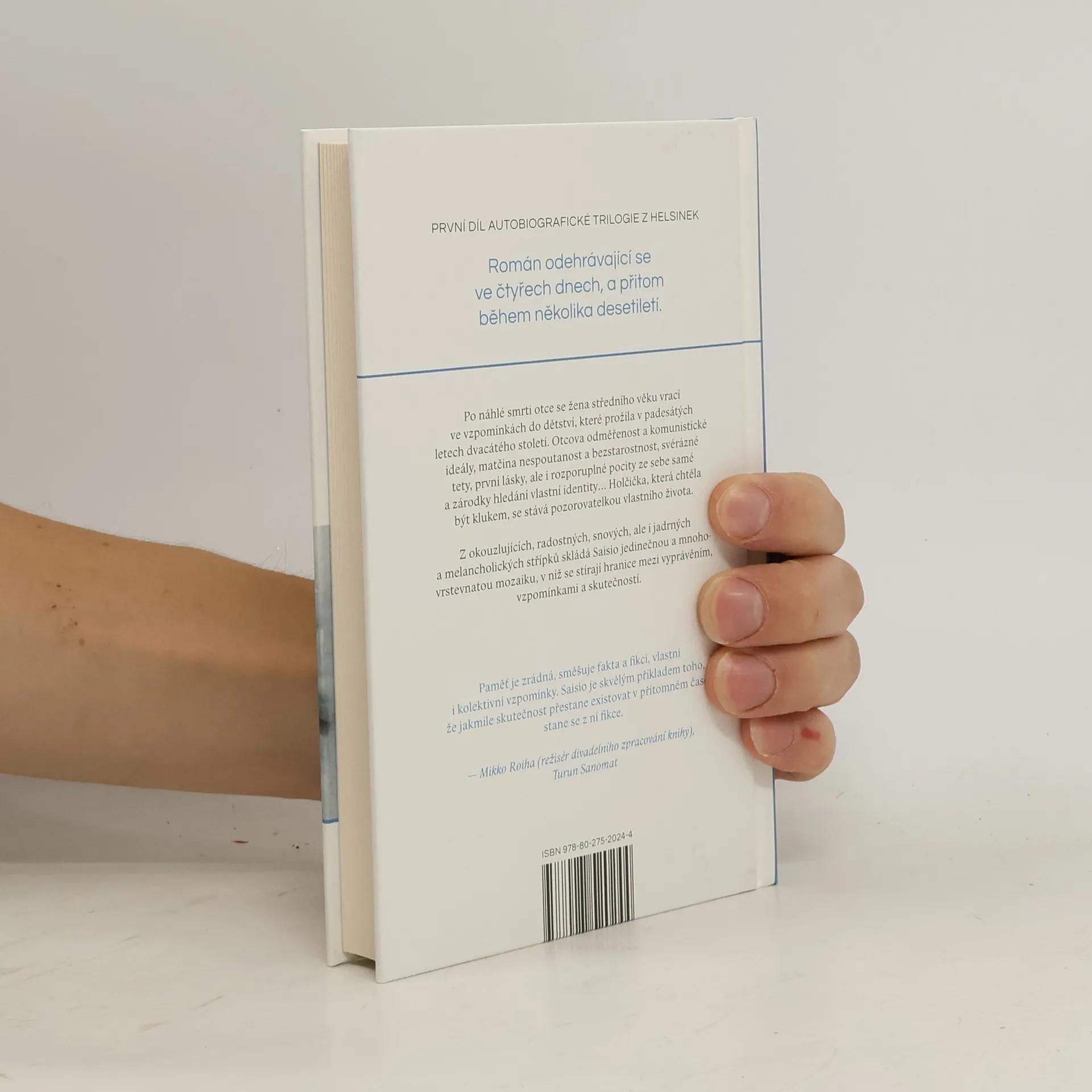 První díl autobiografické trilogie z Helsinek. Román odehrávající se ve čtyřech dnech, a přitom během několika desetiletí. Po náhlé smrti otce se žena středního věku vrací ve vzpomínkách do dětství, které prožila ve čtyřicátých a padesátých letech dvacátého století. Otcova odměřenost a komunistické ideály, matčina nespoutanost a bezstarostnost, svérázné tety, první lásky, ale i rozporuplné pocity ze sebe samé a zárodky hledání vlastní identity. Holčička, která chtěla být klukem, se stává pozorovatelkou vlastního života. Z okouzlujících, radostných, snových, ale i jadrných a melancholických střípků skládá Saisio jedinečnou a mnohovrstevnatou mozaiku, v níž se stírají hranice mezi vyprávěním, vzpomínkami a skutečností.