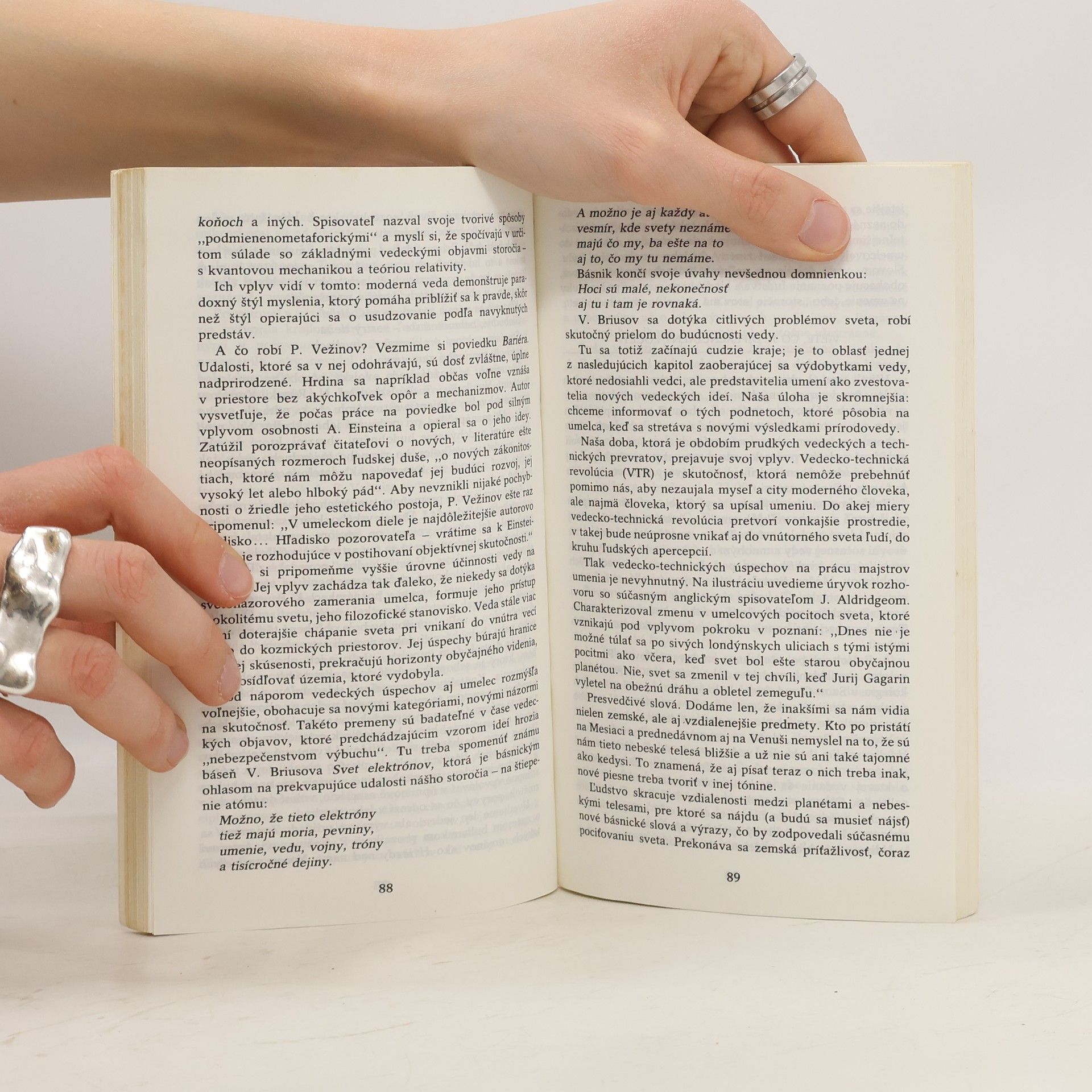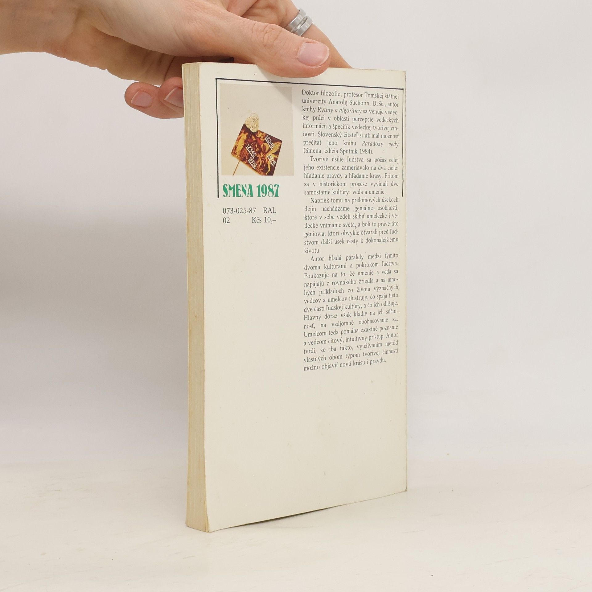 Doktor filozofie, profesor Tomskej štátnej univerzity Anatolij Suchotin, DrSc. sa venuje vedeckej práci v oblasti percepcie vedeckých informácií a špecifík vedeckej tvorivej činnosti. Slovenský čitateľ si už mal možnosť prečítať jeho knihu Paradoxy vedy (Smena, edícia Sputnik 1984). Tvorivéúsilie ľudstva sa počas celej jeho existencie zameriavalo na dva ciele: hľadanie pravdy a hľadanie krásy. Pritom sa v historickom procese vyvinuli dve samostatné kultúry: veda a umenie. Napriek tomu na prelomových úsekoch dejín nachádzame geniálne osobnosti, ktoré v sebe vedeli skĺbiť umelecké i vedecké vnímanie sveta, a boli to práve títo géniovia, ktorí obvykle otvárali pred ľudstvom ďalší úsek cesty k dokonalejšiemu životu. Autor hľadá paralely medzi týmito dvoma kultúrami a pokrokom ľudstva. Poukazuje na to, že umenie a veda sa napájajú z rovnakého žriedla a na mnohých príkladoch zo života význačných vedcov a umelcov ilustruje, čo spája tieto dve časti ľudskej kultúry, a čo ich odlišuje. Hlavný dôraz však kladie na ich súčinnosť, na vzájomné obohacovanie sa. Umelcom teda pomáha exaktné poznanie a vedcom citový, intuitívny prístup. Autor tvrdí, že iba takto, využívaním metód vlastných obom typom tvorivej činnosti možno objaviť novú krásu i pravdu.
