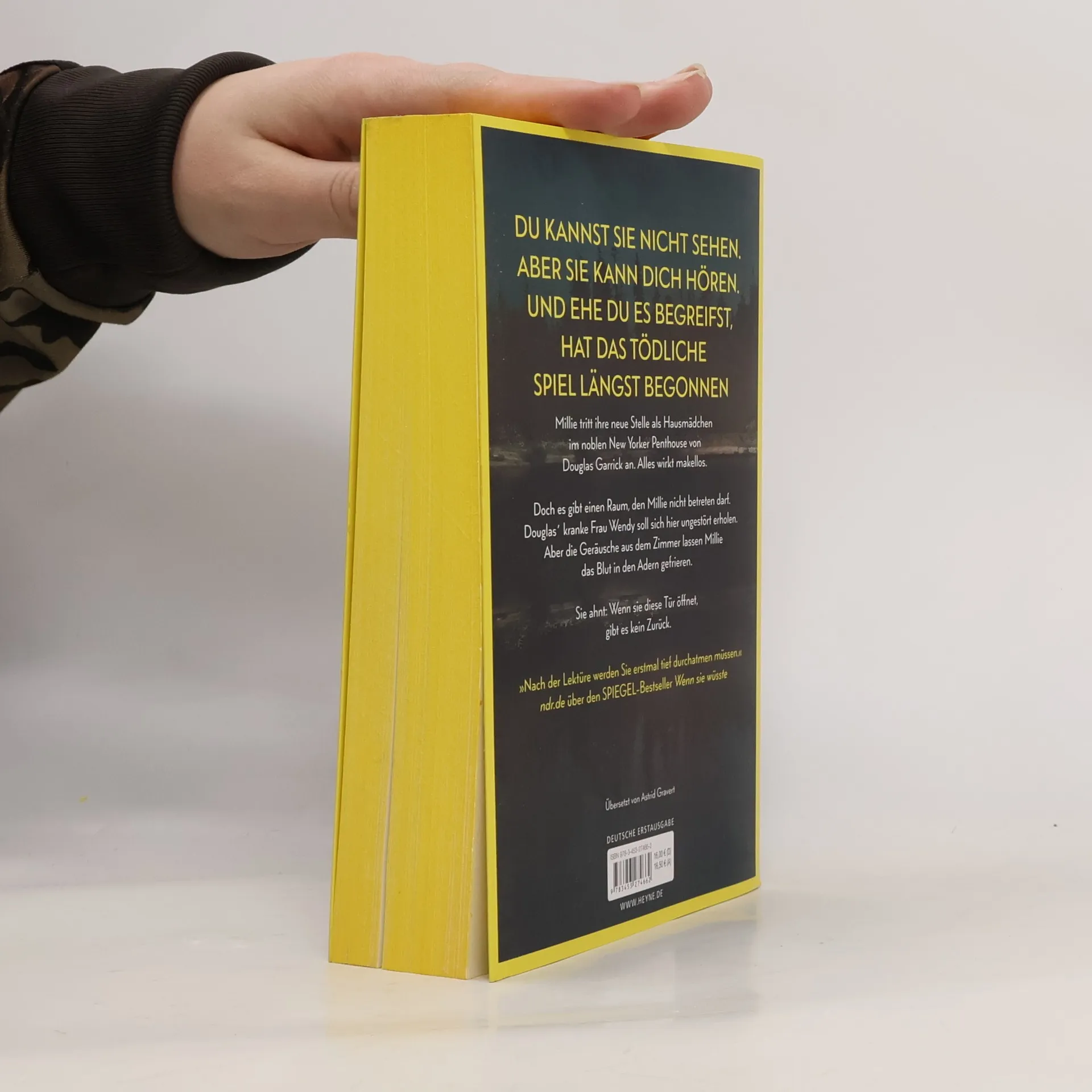 Du kannst sie nicht sehen. Aber sie kann dich hören. Und ehe du es begreifst, hat das tödliche Spiel längst begonnen Millie Calloway hat einen neuen Job. Um sich ihr Studium zu finanzieren, hilft sie einem reichen Paar aus Manhattan im Haushalt. Ihr Arbeitgeber Douglas Garrick wirkt nett, und zum Glück stellt er ihr nicht zu viele Fragen zu ihrer Vergangenheit. Doch warum darf Millie nicht mit seiner Frau Wendy sprechen? Was bedeuten das Weinen, das sie aus dem verschlossenen Zimmer hört, und die Blutflecke auf Wendys Kleidung? Ist Douglas in Wahrheit nicht der fürsorgliche Ehemann, der er vorgibt zu sein? Millie weiß nur eins: Sie muss Wendy helfen. Auch wenn sie damit riskiert, dass ihr dunkelstes Geheimnis doch noch ans Licht kommt.