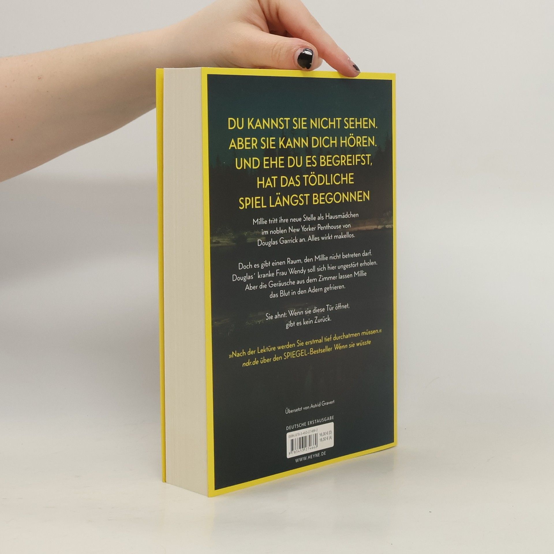 Du kannst sie nicht sehen. Aber sie kann dich hören. Und ehe du es begreifst, hat das tödliche Spiel längst begonnen Millie Calloway hat einen neuen Job. Um sich ihr Studium zu finanzieren, hilft sie einem reichen Paar aus Manhattan im Haushalt. Ihr Arbeitgeber Douglas Garrick wirkt nett, und zum Glück stellt er ihr nicht zu viele Fragen zu ihrer Vergangenheit. Doch warum darf Millie nicht mit seiner Frau Wendy sprechen? Was bedeuten das Weinen, das sie aus dem verschlossenen Zimmer hört, und die Blutflecke auf Wendys Kleidung? Ist Douglas in Wahrheit nicht der fürsorgliche Ehemann, der er vorgibt zu sein? Millie weiß nur eins: Sie muss Wendy helfen. Auch wenn sie damit riskiert, dass ihr dunkelstes Geheimnis doch noch ans Licht kommt.