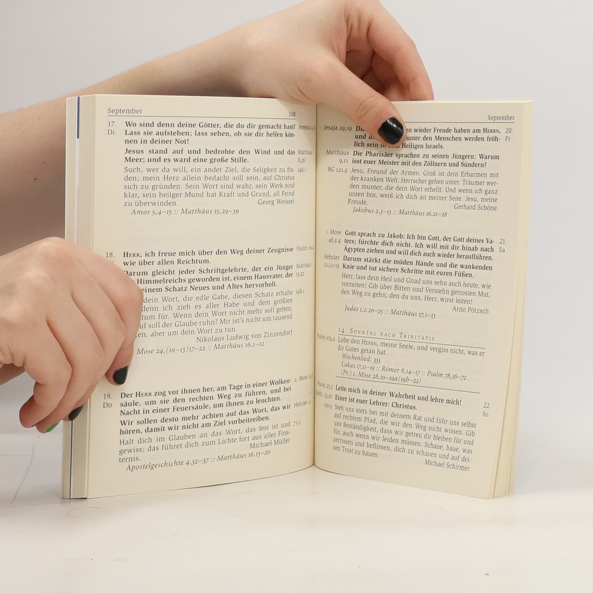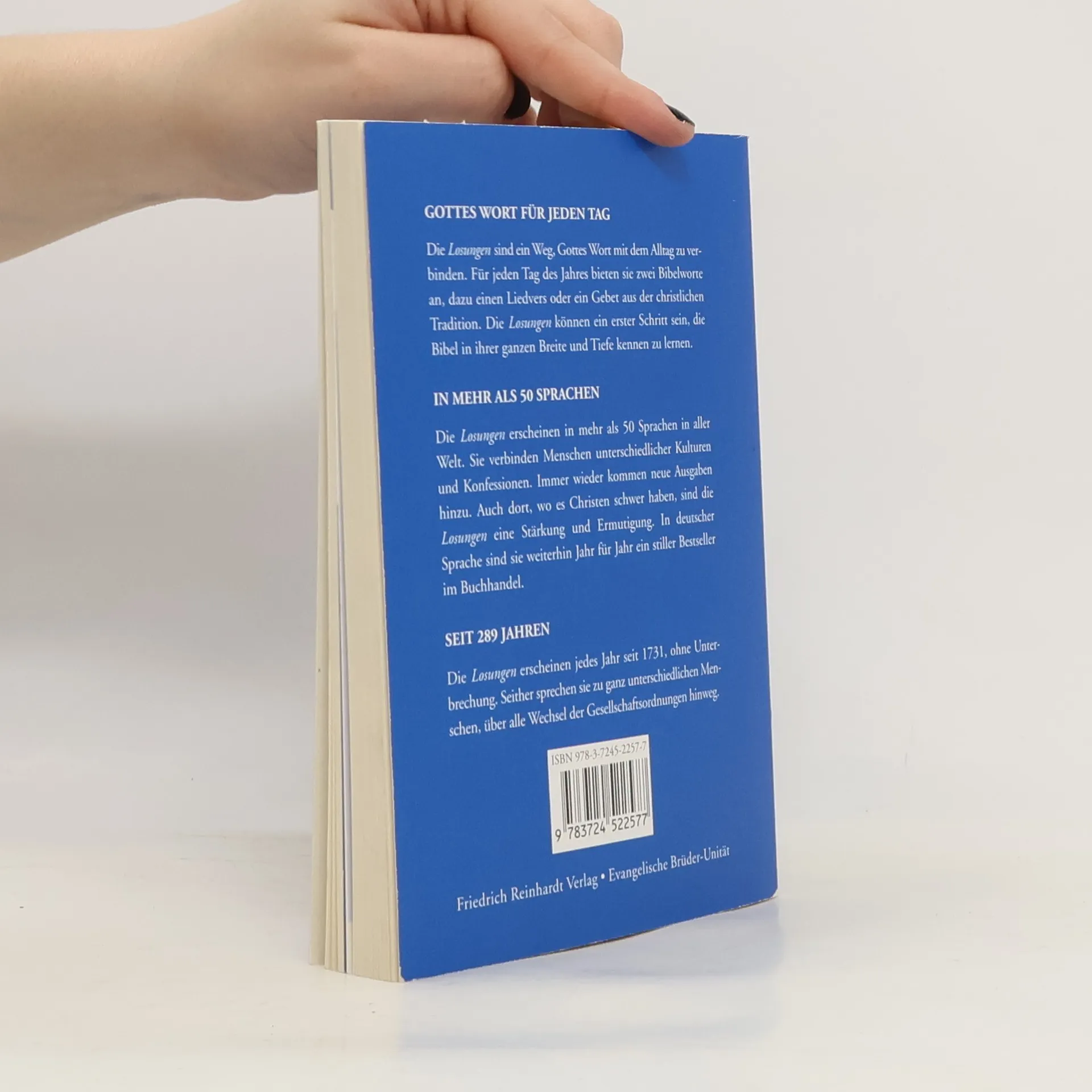 Aus einer Sammlung von rund 1800 Sprüchen aus dem Alten Testament wird jeweils ein Spruch als Leitwort für jeden Tag im Jahr gezogen. Dem alttestamentlichen Vers wird ein Wort aus dem Neuen Testament zugeordnet. Zudem werden die beiden Bibelworte durch ein Gebet oder einen literarischen Text sinnreich ergänzt.