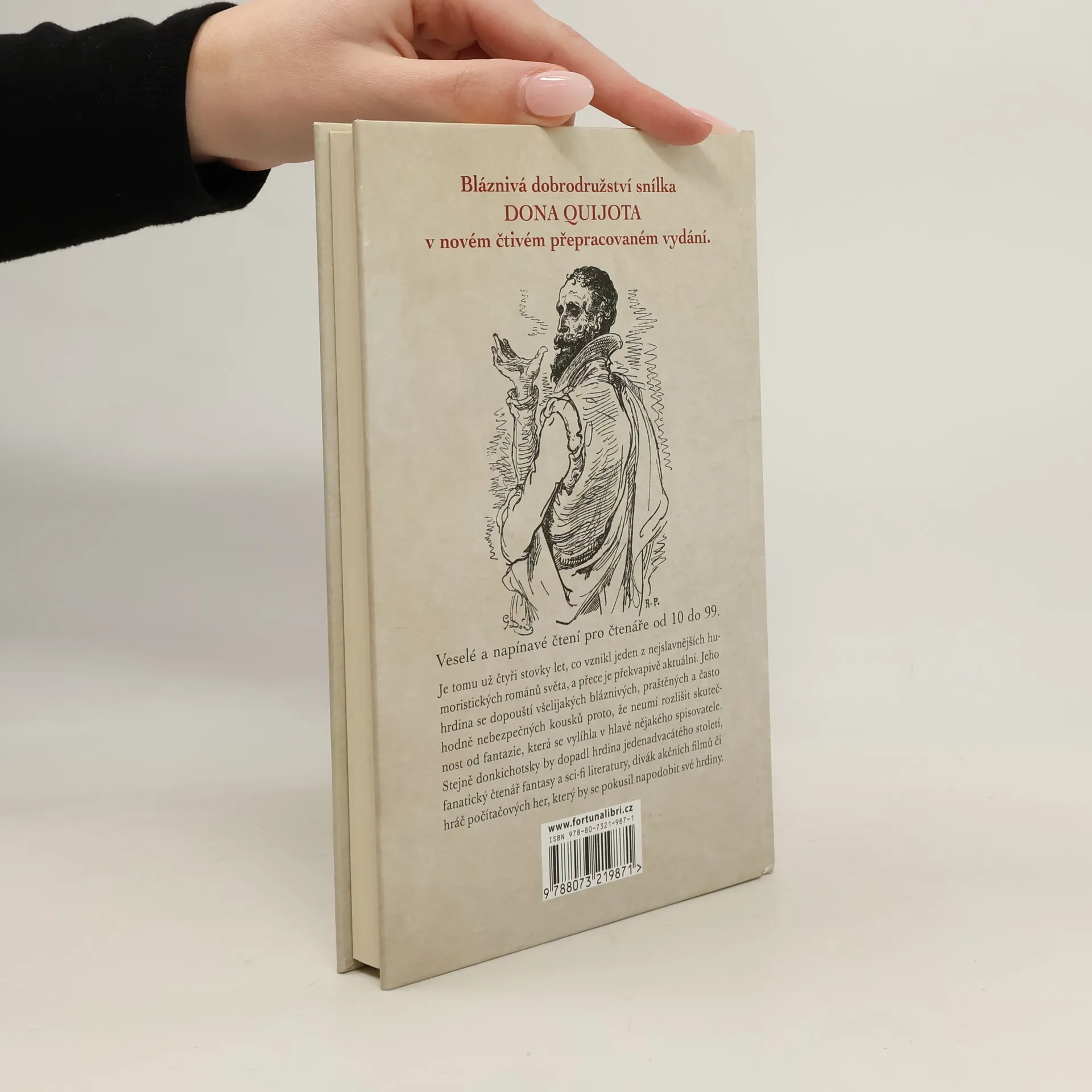 Bláznivá dobrodružství snílka Dona Quijota v novém čtivém přepracovaném vydání. Je tomu už čtyři stovky let, co vznikl jeden z nejslavnějších humoristických románů světa, a přece je překvapivě aktuální. Jeho hrdina se dopouští všelijakých bláznivých, praštěných a často hodně nebezpečných kousků proto, že neumí rozlišit skutečnost od fantazie, která se vylíhla v hlavě nějakého spisovatele. Stejně donkichotsky by dopadl hrdina jedenadvacátého století, fanatický čtenář fantasy a sci-fi literatury, divák akčních filmů či hráč počítačových her, který by se pokusil napodobit své hrdiny.