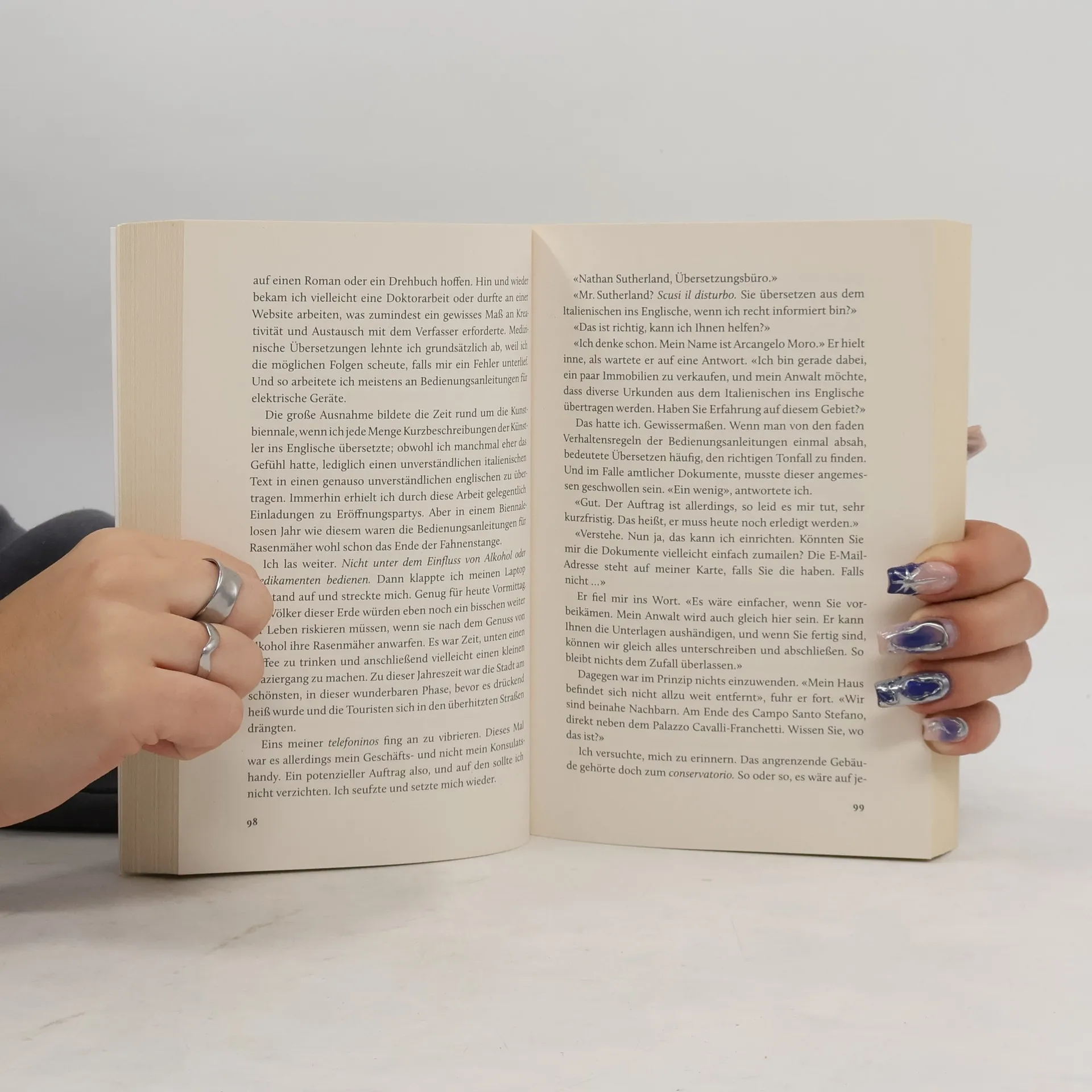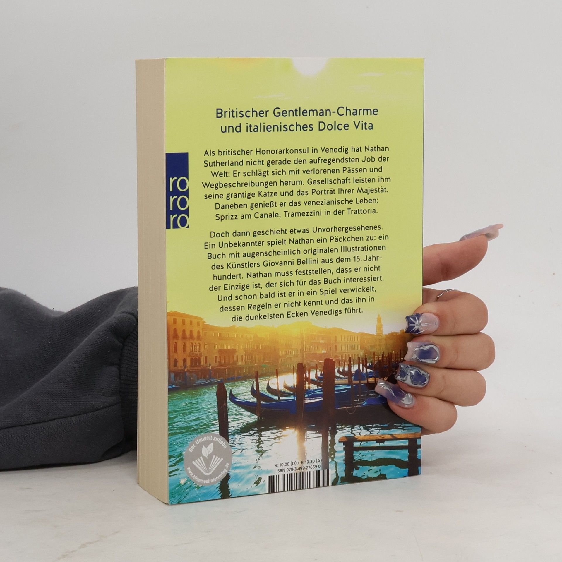 Band 1 der atmosphärischen Venedig-Krimi-Serie um Nathan Sutherland. Britischer Gentleman-Charme trifft auf italienisches Dolce Vita. Als britischer Ehrenkonsul in Venedig hat Nathan Sutherland nicht gerade den aufregendsten Job der Welt: Er schlägt sich mit verlorenen Pässen und Wegbeschreibungen herum. Gesellschaft leisten ihm seine grantige Katze und das Porträt Ihrer Majestät. Daneben genießt er das venezianische Leben: Aperol am Canale, Tramezzini in der Trattoria. Dann geschieht etwas Unvorhergesehenes: Ein Unbekannter spielt Nathan ein Päckchen zu: ein Buch mit augenscheinlich originalen Illustrationen des Künstlers Giovanni Bellini aus dem 15. Jahrhundert. Schon bald muss Nathan feststellen, dass sich noch jemand anderes für das Buch interessiert ...