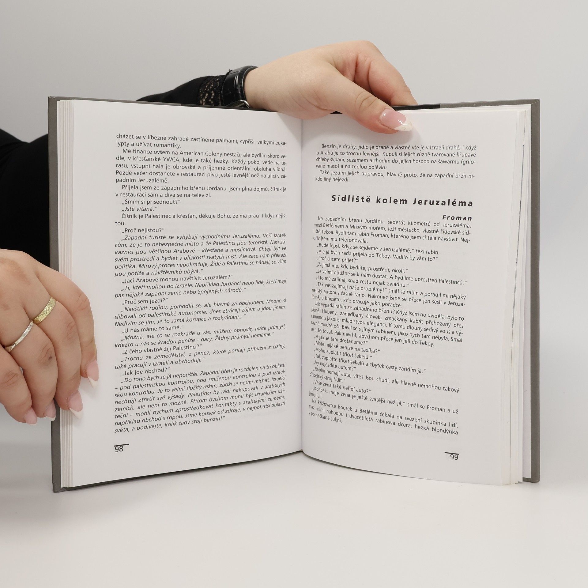 Pestrá mozaika dojmů, úvah, komentářů a zamyšlení z cesty po oblasti, která je jedním z neuralgických bodů současného světa i kolébkou jeho kultury. Kniha je na rozhraní cestopisu a historicko-politické publicistiky. Poznatky a zážitky z návštěv Izraele a Palestiny z pera redaktorky Českého rozhlasu. Obsah: Tel Aviv, Gaza, Jeruzalém, Betlém, Hebron-Chalíl, Beduíni, Amos Oz, Náblus, Ariel, Jericho - Aríha, Mohamed Said Ahmed, Haifa, Vesnice, které nejsou na mapě, Akko, Golany, Mrtvé moře, Přejdi Jordán, Rudé moře, Post scriptum, Chronologie některých důležitých událostí.