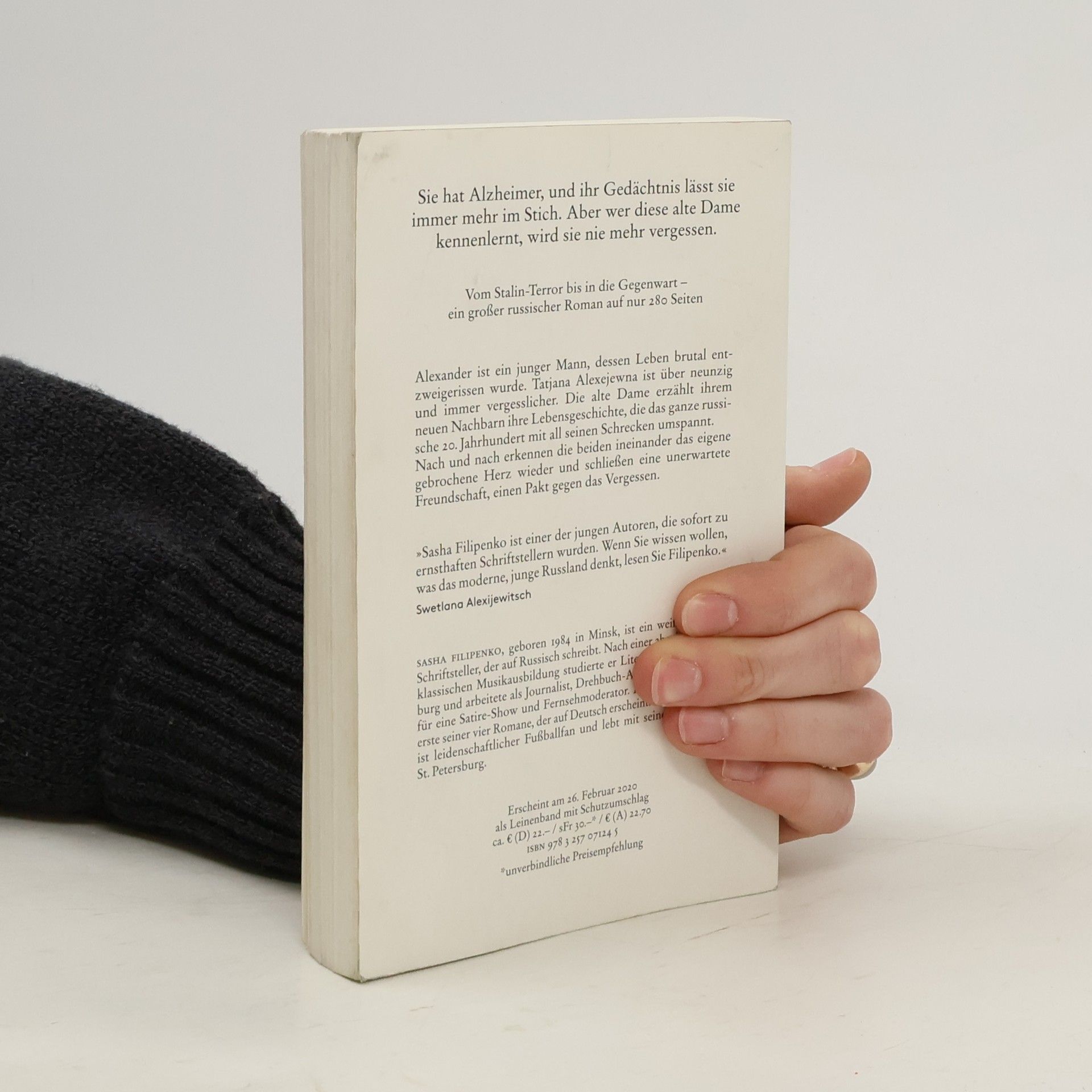 Alexander ist ein junger Mann, dessen Leben brutal entzweigerissen wurde. Tatjana Alexejewna ist über neunzig und immer vergesslicher. Die alte Dame erzählt ihrem neuen Nachbarn ihre Lebensgeschichte, die das ganze russische 20. Jahrhundert mit all seinen Schrecken umspannt. Nach und nach erkennen die beiden ineinander das eigene gebrochene Herz wieder und schließen eine unerwartete Freundschaft, einen Pakt gegen das Vergessen.