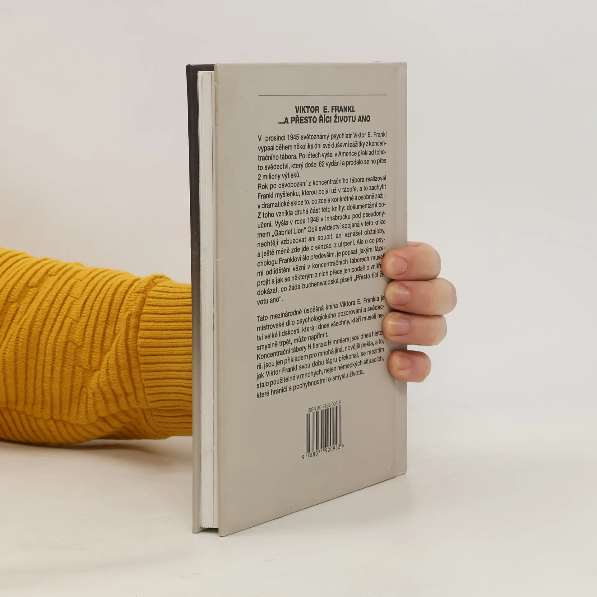 Svazek A přesto říci životu ano spojuje dva texty zakladatele logoterapie, psychiatra s českými kořeny Viktora Emanuela Frankla (1905–1997). V díle Psycholog prožívá koncentrační tábor, jež vzniklo během necelých dvou prosincových týdnů roku 1945, popisuje to, jakými fázemi odlidštění museli vězni procházet. Mnohým z nich tato strašná zkušenost přesto otevřela cestu k porozumění smyslu vlastního života. Hra Synchronizace v Březince z roku 1948, napsaná velmi působivým skicovitým způsobem, je myšlenkovým i literárně dramatickým experimentem. Propojují se v něm Franklovy bezprostřední osobní zážitky z tábora smrti s pomyslnou reflexí a dialogem tří filozofů, kteří mu byli blízcí – Sokrata, Spinozy a Kanta. Podle Frankla zůstává v člověku i v značně extrémní situaci prostor svobody a odpovědnosti, kterého se nesmíme za žádnou cenu vzdát: „Nic nemůže udolat člověka, který si vědomě přeje mít životní cíl.“