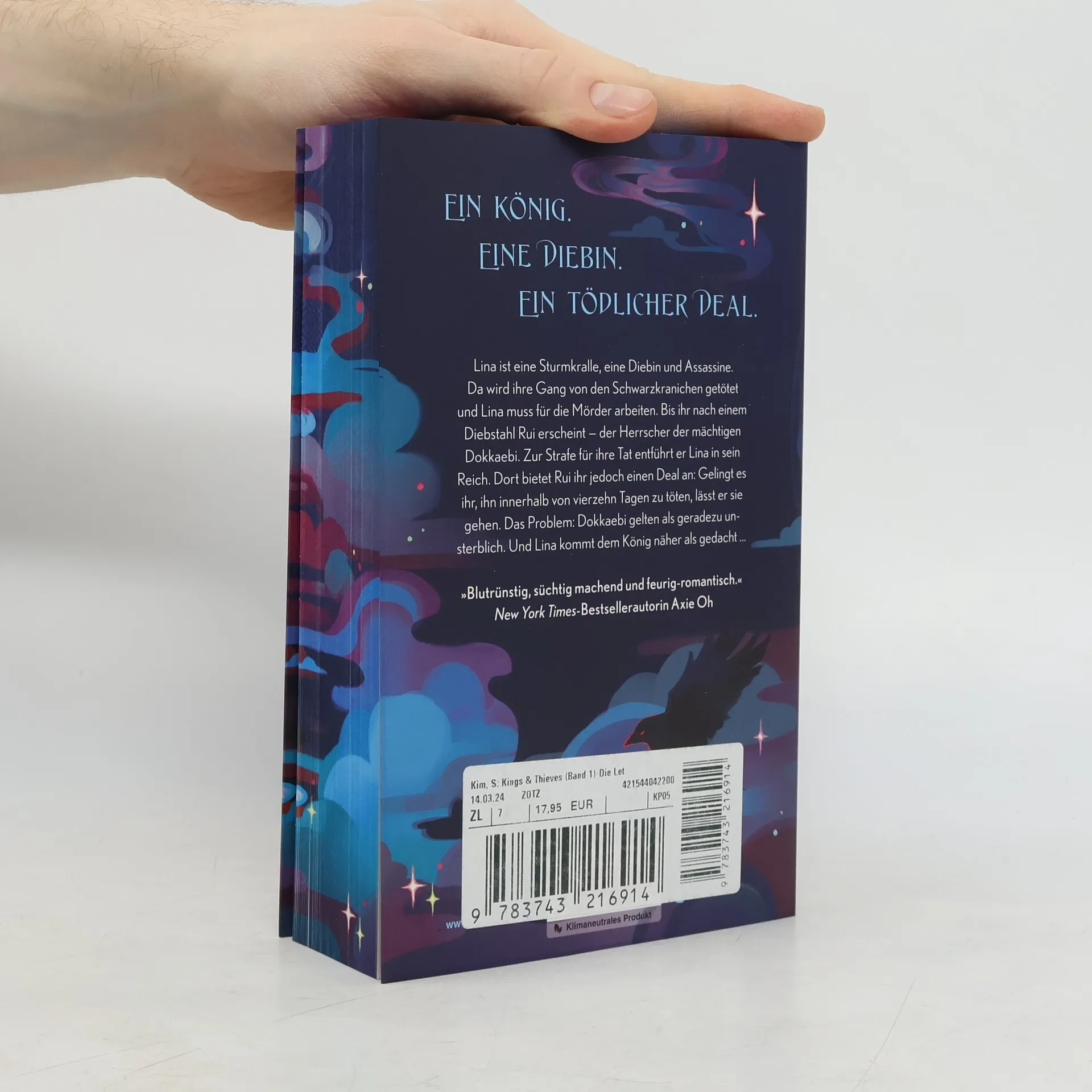 Das Buch ist bei deiner Buchhandlung vor Ort und bei vielen Online-Buchshops erhältlich! Ein König. Eine Diebin. Ein tödlicher Deal. Lina ist eine Sturmkralle, eine Diebin und Assassine. Da wird ihre Gang von den Schwarzkranichen getötet und Lina muss für die Mörder arbeiten. Bis ihr nach einem Diebstahl Rui erscheint – der Herrscher der mächtigen Dokkaebi. Zur Strafe für ihre Tat entführt er Lina in sein Reich. Dort bietet Rui ihr jedoch einen Deal an: Gelingt es ihr, ihn innerhalb von vierzehn Tagen zu töten, lässt er sie gehen. Das Problem: Dokkaebi gelten als nahezu unsterblich. Und Lina kommt dem König näher als gedacht … Tauche ein in die Welt dieser koreanischen Jugendfantasy mit prickelnder Romance! Sophie Kim entführt dich in ihrer fesselnden Fantasy-Trilogie in eine Welt, in der koreanische Sagenelemente auf die geheimnisvolle Welt der Diebe und Verbrecher treffen. Diese einzigartige Kombination aus koreanischer Mythologie und Sagenwelt mit einem fesselnden Einblick in das Leben der Diebe und Verbrecher schafft eine atemberaubende Kulisse für die Geschichte – mit einer toughen Protagonistin, spannenden Plottwists und einer Enemies-to-Lovers-Geschichte , von der man nicht genug bekommen kann. Herzklopfen garantiert! Mit edlem Farbschnitt - nur in der limitierten Erstauflage
