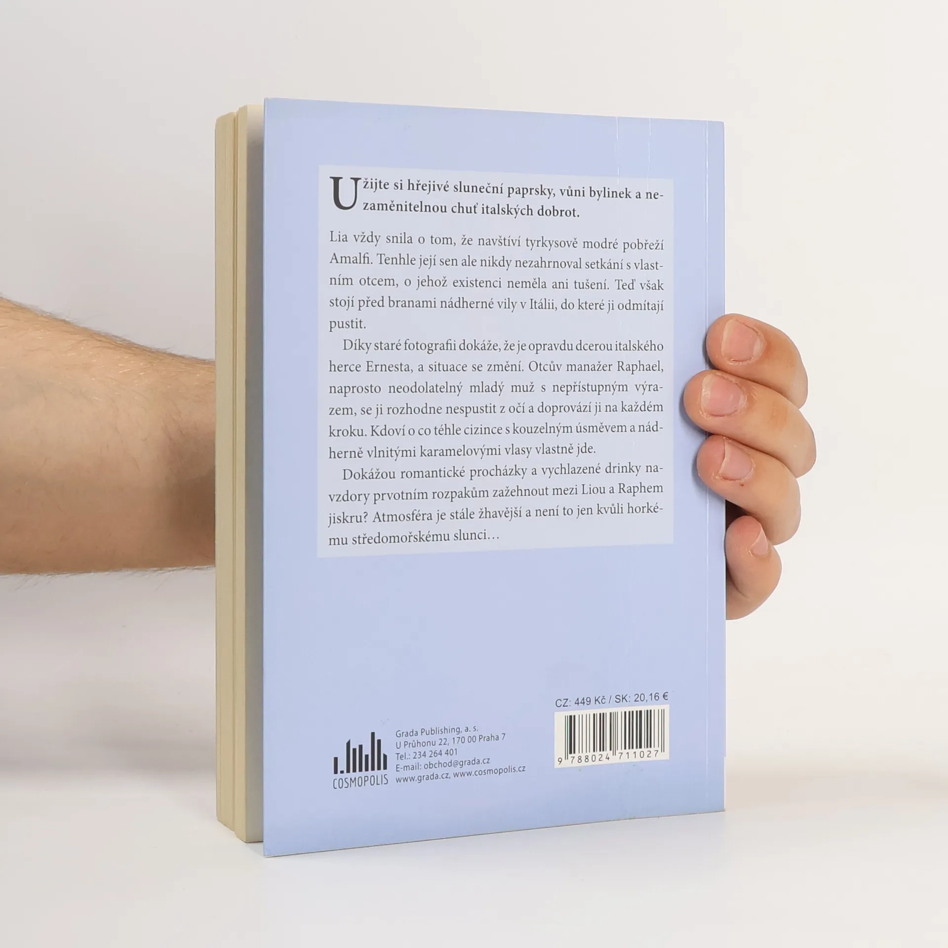 Lia vždy snila o tom, že navštíví tyrkysově modré pobřeží Amalfi. Tenhle její sen ale nikdy nezahrnoval setkání s vlastním otcem, o jehož existenci neměla ani tušení. Teď však stojí před branami nádherné vily v Itálii, do které ji odmítají pustit. Díky staré fotografii dokáže,že je opravdu dcerou italského herce Ernesta, a situace se změní. Otcův manažer Raphael, naprosto neodolatelný mladý muž s nepřístupným výrazem, se ji rozhodne nespustit z očí a doprovází ji na každém kroku. Kdoví o co téhle cizince s kouzelným úsměvem a nádherně vlnitými karamelovými vlasy vlastně jde. Dokážou romantické procházky a vychlazené drinky i přes počáteční rozpaky zažehnout mezi Liou a Raphem jiskru? Atmosféra je stále žhavější a není to jen kvůli horkému středomořskému slunci.