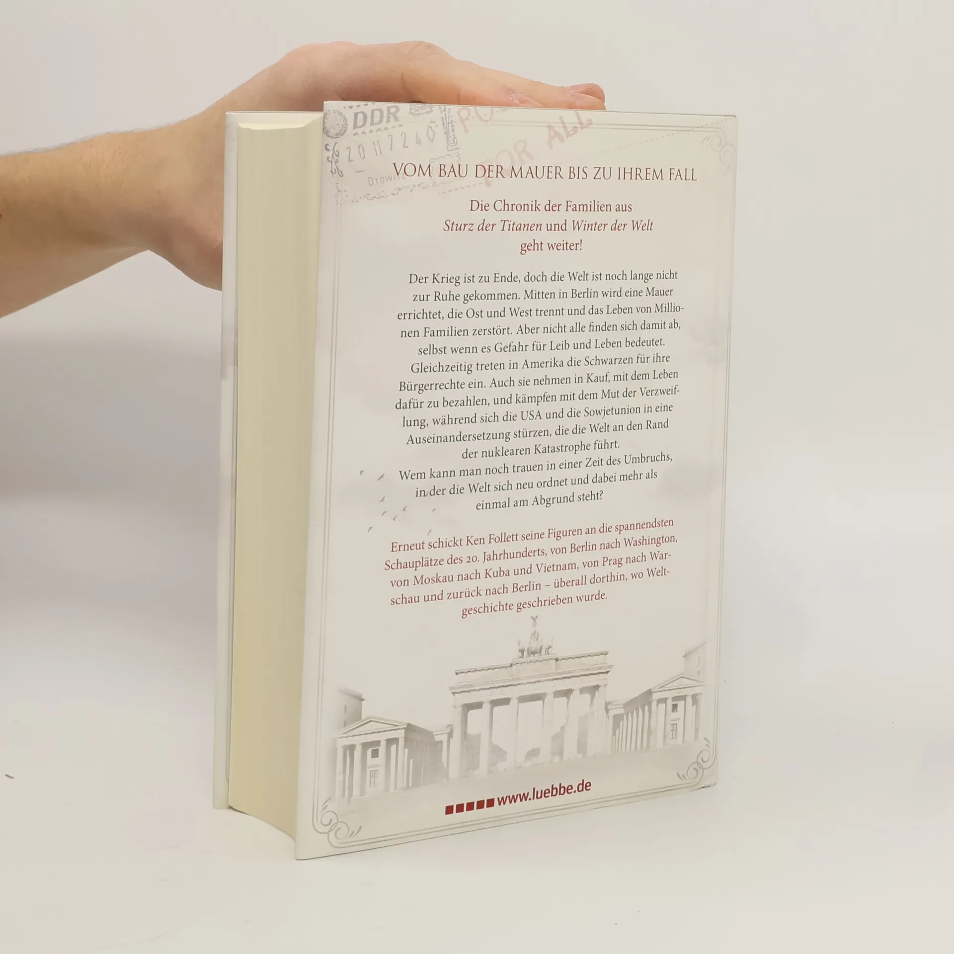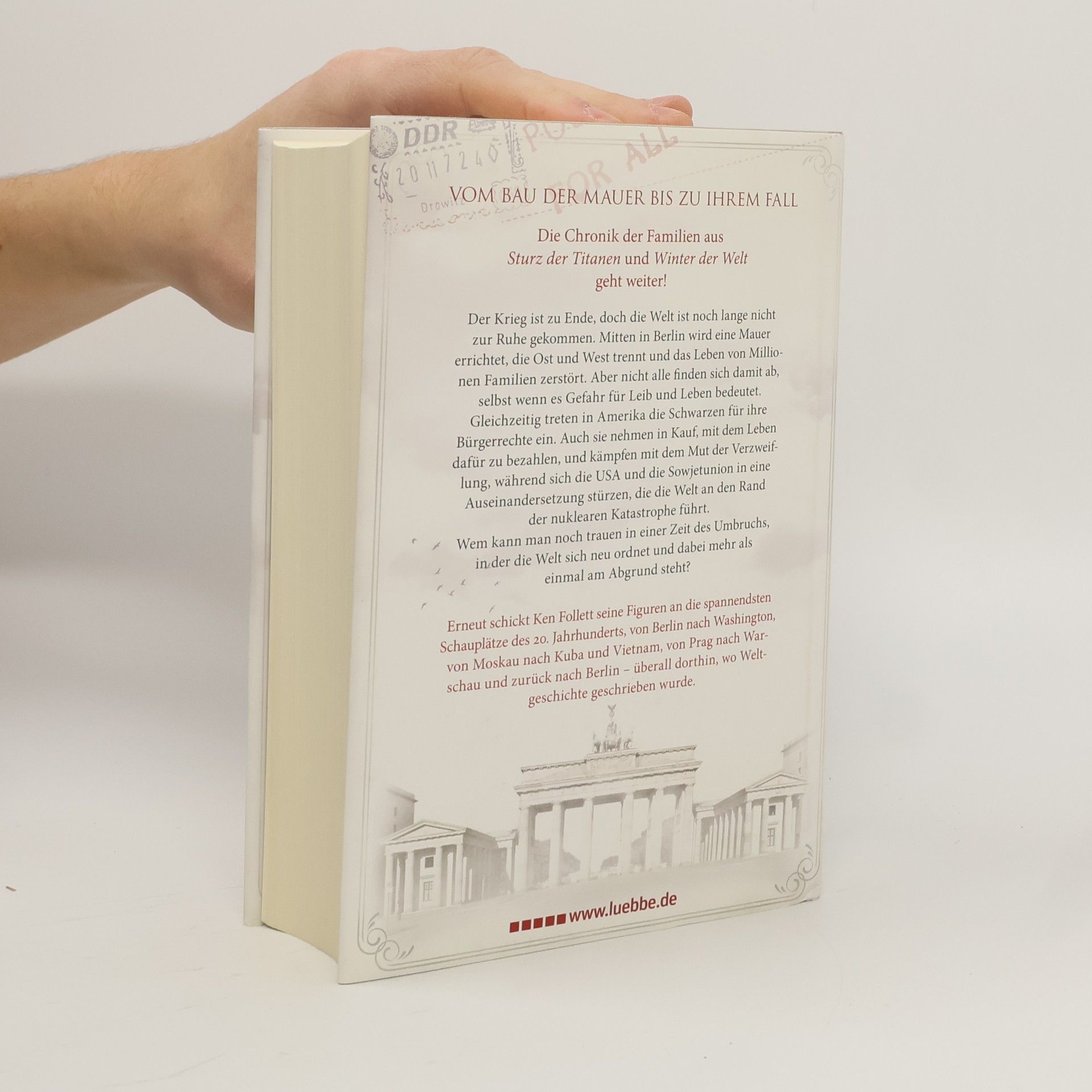 VOM BAU DER MAUER BIS ZU IHREM FALL erzählt die epische Familiensaga des Autors der Bestseller. In Ostberlin scheint das Leben von Rebecca Hoffmann in Ordnung, bis sie entdeckt, dass ihr Mann sie im Auftrag der Stasi bespitzelt. Ihr konfrontatives Handeln führt zu einem verhängnisvollen Fehler, der das Schicksal ihrer Familie für immer verändert. In den USA kämpft George Jakes, ein Vertrauter von Justizminister Robert Kennedy, hautnah gegen Rassismus und Ungerechtigkeit und erlebt die Herausforderungen, die mit seiner Hautfarbe verbunden sind. Cameron Dewar, ein Republikaner und CIA-Agent, navigiert durch eine Welt voller Täuschung und Intrigen, während Dimka Dworkin, Berater von Nikita Chruschtschow, in den Konflikt zwischen Sowjetunion und USA verwickelt wird, der die Welt an den Rand des Atomkriegs führt. Seine Schwester Tanja, Journalistin, verfolgt die Ereignisse an den Brennpunkten von Moskau über Kuba bis nach Prag und Warschau. Der Roman verknüpft die Schicksale von Menschen aus Ost und West vor dem Hintergrund der politischen Umwälzungen von den frühen Sechzigern bis zum Ende der Achtzigerjahre und bildet den packenden Abschluss von Ken Folletts Jahrhundert-Trilogie.