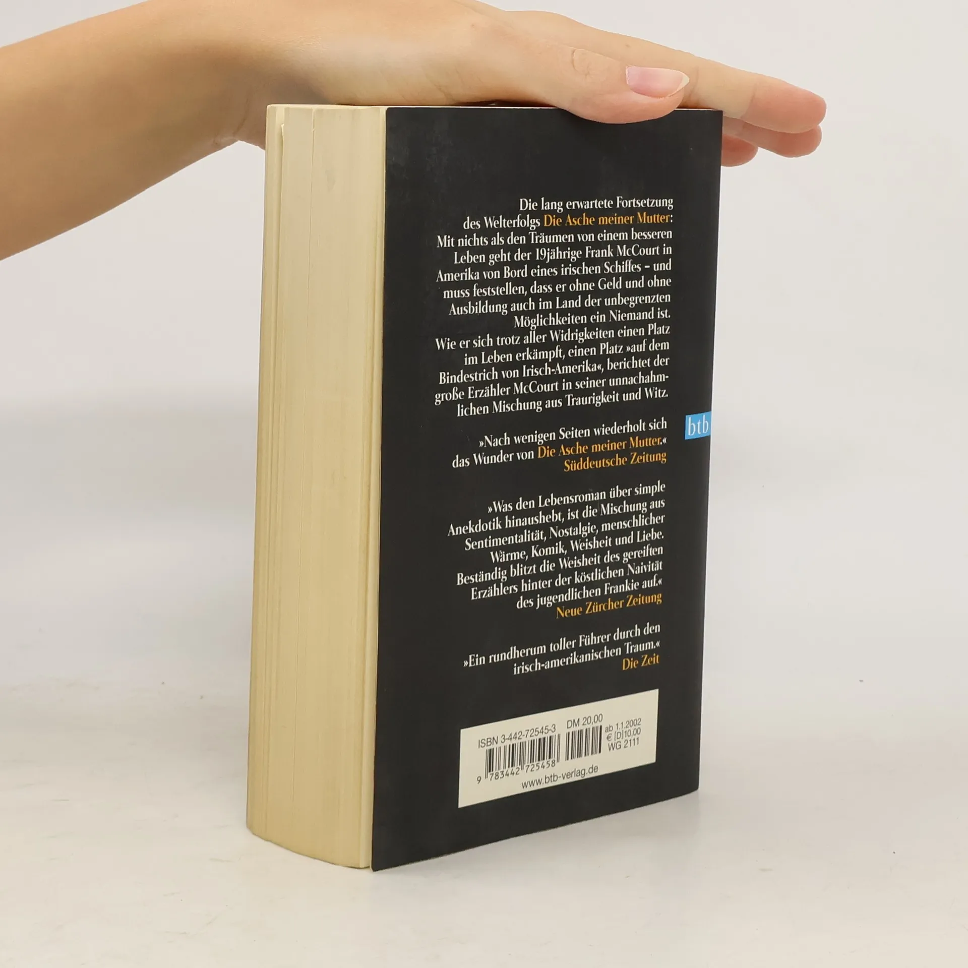 „‘Die Asche meiner Mutter‘ ist so gut – sie verdient eine Fortsetzung.“ So schrieb die New York Times über Frank McCourts Bestseller. Mit dem vorliegenden Buch erfüllte der Autor nicht nur den Wunsch seines Rezensenten, sondern auch die Hoffnungen der Millionen von begeisterten Lesern und schrieb seine Geschichte fort. „Ein rundherum tolles Land“ beginnt dort, wo der erste Teil endet: als Frank McCourt mit 19 Jahren an Bord eines irischen Schiffes nach Amerika kommt und nichts hat als die Hoffnung auf eine bessere Zukunft. Arm, mit schlechten Zähnen und entzündeten Augen, ohne jede nennenswerte Ausbildung, erreicht er das Land seiner Träume – und muss feststellen, dass er mit seinem Aussehen und seinem irischen Akzent ein Nichts ist. Wie er sich trotz aller Widrigkeiten einen Platz im Leben erkämpft, einen Platz „auf dem Bindestrich von Irisch-Amerika“, berichtet der große Erzähler McCourt in seiner unnachahmlichen Mischung aus Traurigkeit und Witz. Seine unglaublichen Geschichten über Priester und Jungfrauen, über irische Kneipen, bayrische Bierkeller und die merkwürdigen Sitten der Amerikaner im Allgemeinen verbinden sich zu einer augenzwinkernden Hommage an das Land der unbegrenzten Möglichkeiten, in der „toll“ nicht nur „großartig“ bedeutet.