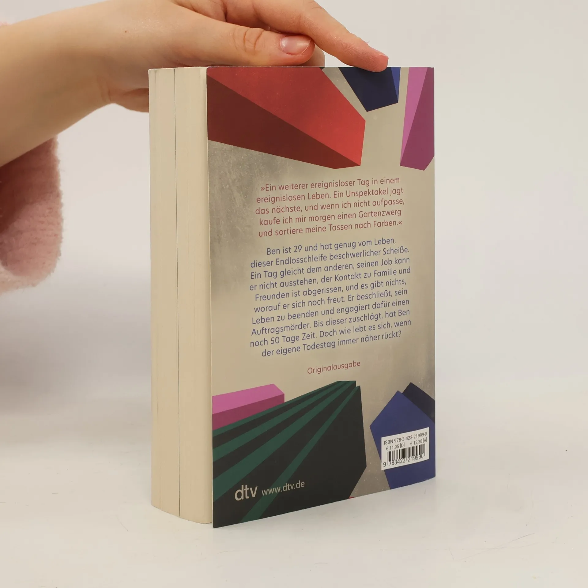»Ein weiterer ereignisloser Tag in einem ereignislosen Leben. Ein Unspektakel jagt das nächste, und wenn ich nicht aufpasse, kaufe ich mir morgen einen Gartenzwerg und sortiere meine Tassen nach Farben.« Ben Schneider ist erst 29, hat aber schon genug vom Leben im Hamsterrad: aufstehen, arbeiten, Sorgen machen, sterben. Seinen Job bei einer Wirtschaftsprüfungskanzlei hasst er mindestens so sehr wie seinen Vorgesetzten. Der Kontakt zu seiner Familie ist größtenteils abgerissen, für die Liebe oder Freunde hat er schon lange keine Zeit mehr. Wenn ihm das Leben also nichts mehr zu bieten hat, findet Ben, könnte er doch zumindest über einen coolen Abgang nachdenken. Einfallsreich und überraschend sollte der sein. Sein Dealer Tobi hat die perfekte Lösung: Er kann ihm im Darknet einen Auftragskiller besorgen. Ben ist einverstanden, will aber noch 50 Tage Zeit haben bis zum großen Finale. Doch wie lebt es sich, wenn der eigene Todestag immer näher rückt?