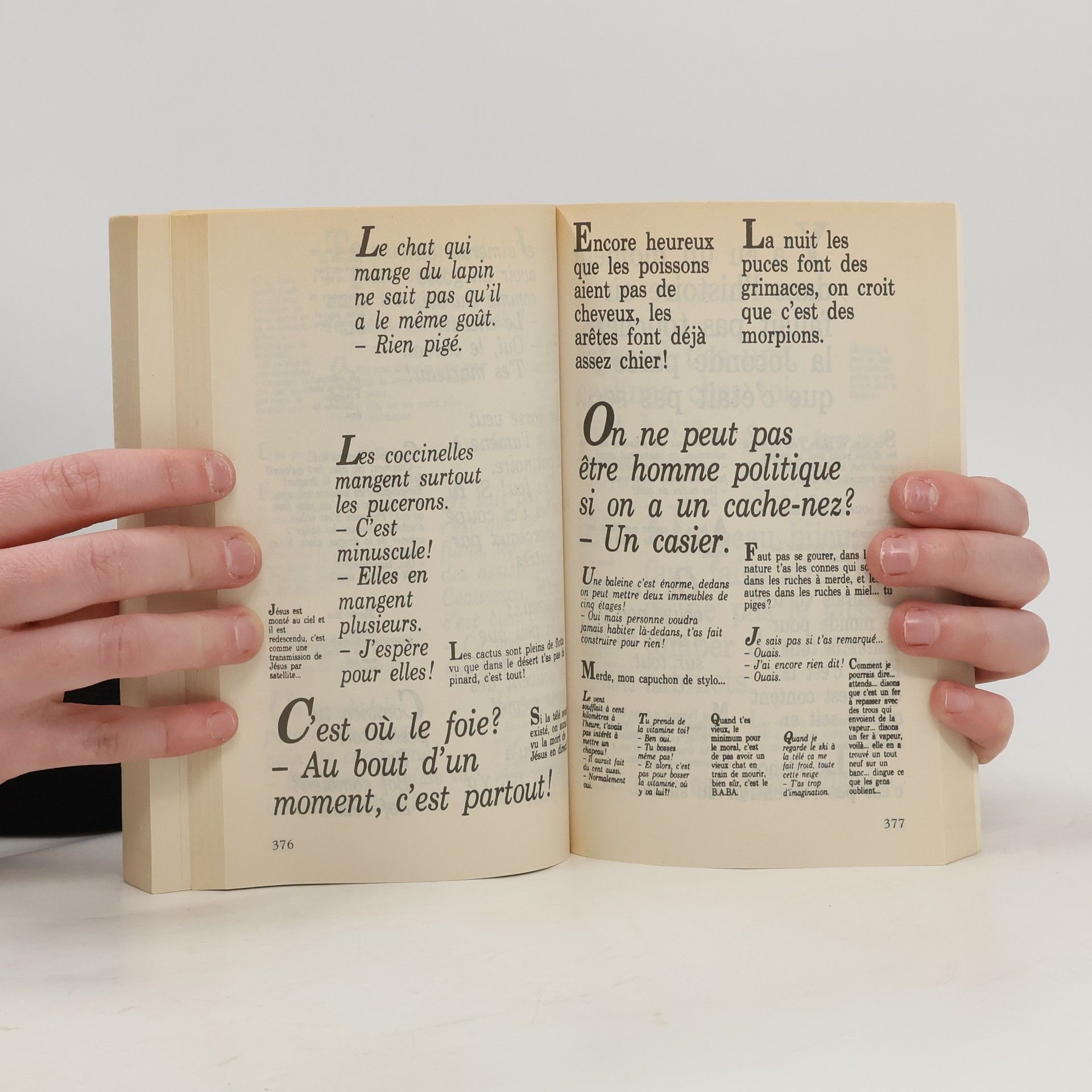 " Le monde est tellement con, on dirait que c'est moi qui fais tout ! " " C'est quand même pas un chômeur qui va m'apprendre mon boulot " " T'as vu les inondations à Nîmes, ils vont devoir faire la corrida avec des phoques. " " C'est vraiment très fonctionnel comme meuble pour ranger le saucisson et le pâté. " " Tu vas voir comment le prix de l'essence y va monter ! - Moi, ça va rien changer je prends toujours 100 francs d'essence. " " Mais pourquoi il attaque pas, Saddam Hussein, pourquoi ? - Tu veux mon avis, toutes ses armes sont enterrées, et il sait plus où il les a mises, comme des fois les écureuils... "