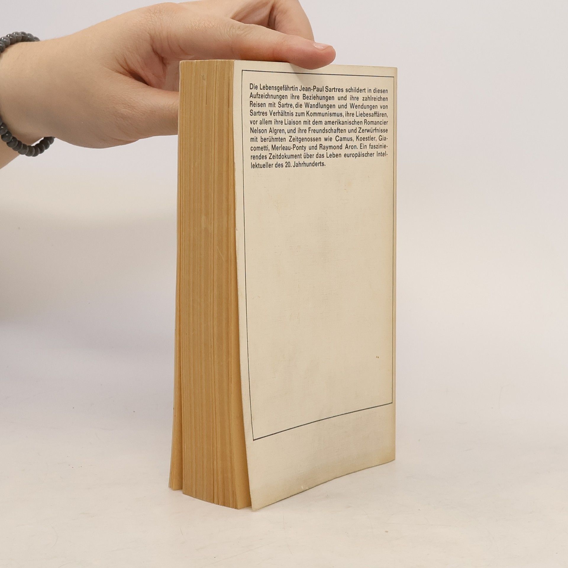 Die Lebensgefährtin Jean Paul Sartres schildert in diesen Aufzeichnungen ihre Beziehungen und ihre zahlreichen Reisen mit Sartre, die Wandlungen und Wendungen von Sartres Verhältnis zum Kommunismus, ihre Liebesaffären, vor allem ihre Liaison mit dem amerikanischen Romancier Nelson Algren, und ihre Freundschaften und Zerwürfnisse mit berühmten Zeitgenossen wie Camus, Koestler, Giacometti, Merleau-Ponty und Raymond Aron. Ein faszinierendes Zeitdokument über das Leben europäischer Intellektueller des 20. Jahrhunderts.