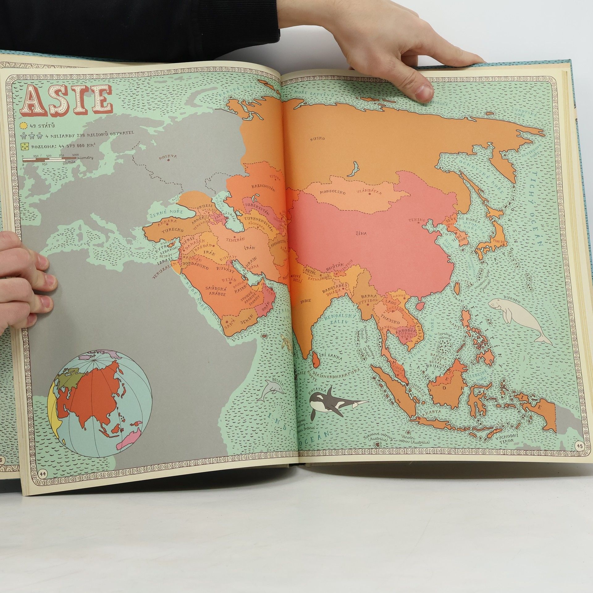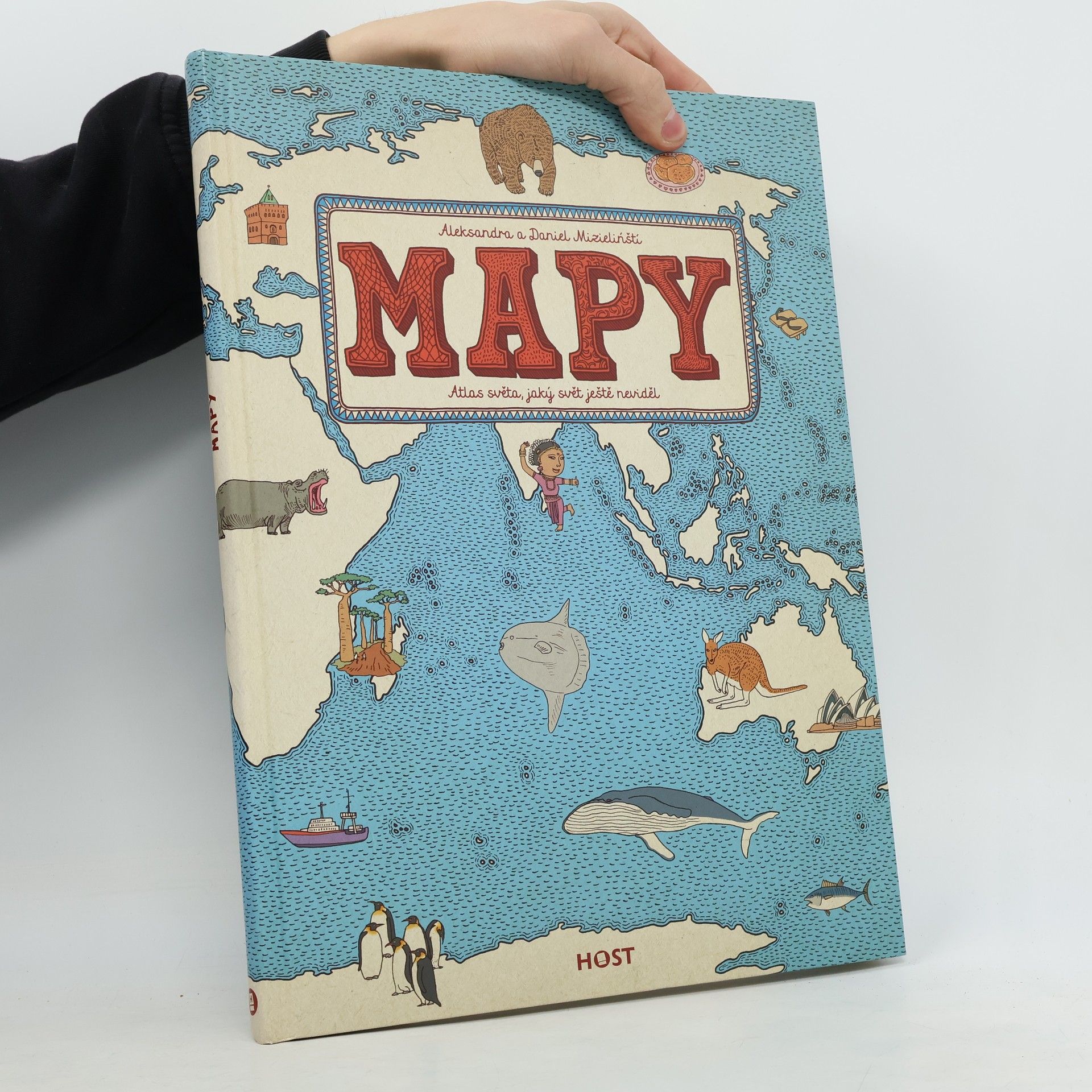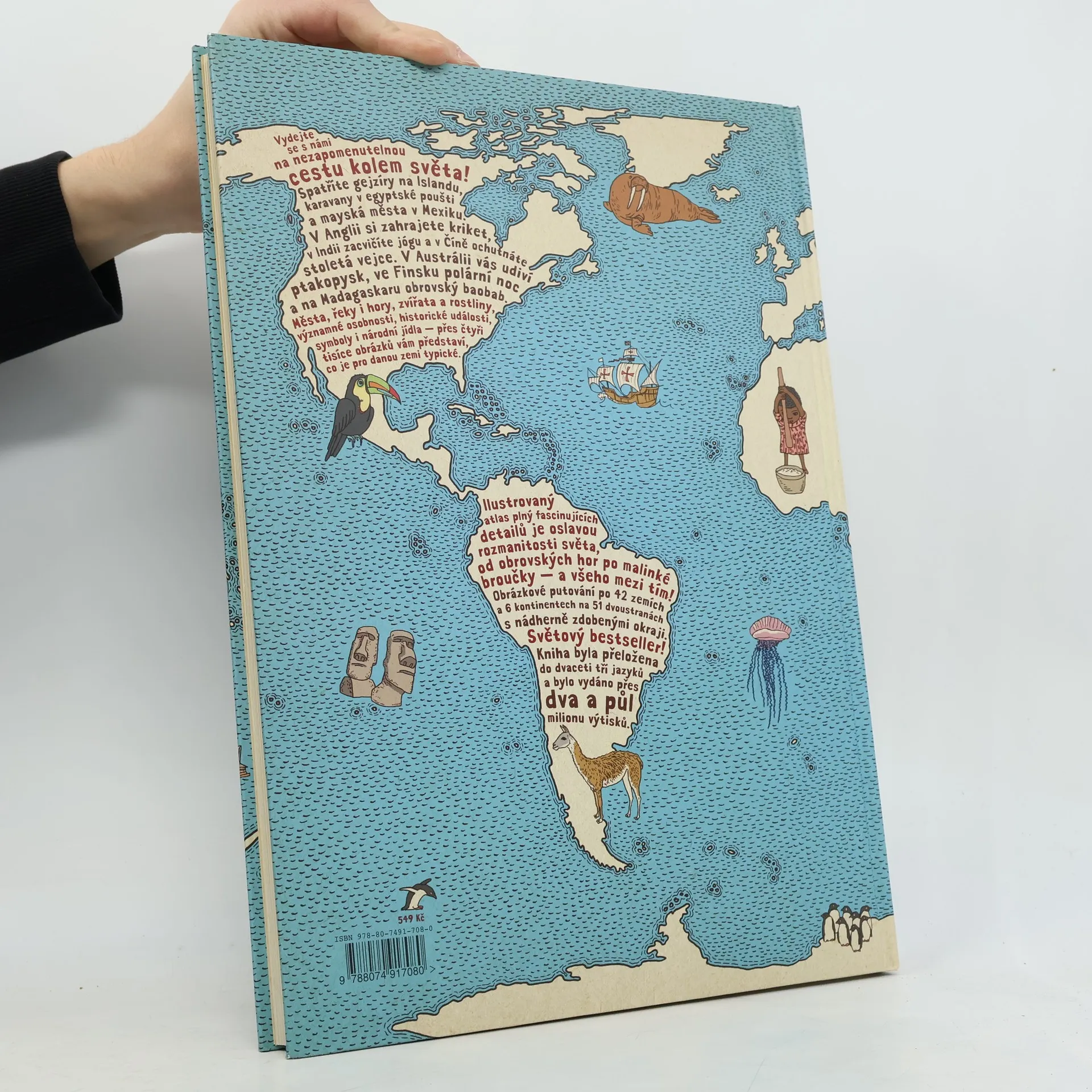 Vydejte se s námi na nezapomenutelnou cestu kolem světa... Spatříte gejzíry na Islandu, karavany v egyptské poušti a mayská města v Mexiku. V Anglii si zahrajete kriket, v Indii zacvičíte jógu a v Číně ochutnáte stoletá vejce. V Austrálii vás udiví ptakopysk, ve Finsku polární noc a na Madagaskaru obrovský baobab. Města, řeky i hory, zvířata a rostliny, významné osobnosti, historické události, symboly i národní jídla — přes čtyři tisíce obrázků vám představí, co je pro danou zemi typické. Obrázkové putování po dvaačtyřiceti zemích a šesti kontinentech na jednapadesáti dvoustranách s nádherně zdobenými okraji, které připomínají mapy dávných objevitelů a mořeplavců. Ilustrovaný atlas plný fascinujících detailů je oslavou rozmanitosti světa, od obrovských hor po malinké broučky — a všeho mezi tím. Atlas světa, jaký svět ještě neviděl!