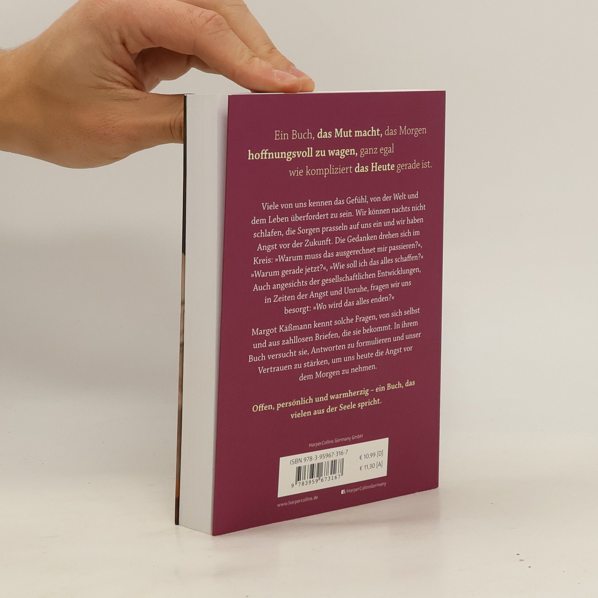 Viele kennen das Gefühl, von der Welt und dem Leben überfordert zu sein. Wir können nachts nicht schlafen, die Sorgen prasseln auf uns ein und wir haben Angst vor der Zukunft. »Wo wird das alles enden?«, »Warum muss das mir passieren? »Wie krieg ich mein Leben wieder hin?« Auch Margot Käßmann kennt solche Fragen - von sich selbst und aus zahllosen Briefen, die sie bekommt. In ihrem neuen Buch versucht sie, Antworten zu formulieren. Offen, ganz persönlich, warmherzig, voller Liebe zum Menschen. Ein Buch, das uns aus der Seele spricht und das Mut macht, das Morgen hoffnungsvoll zu wagen, ganz egal wie kompliziert das Heute gerade ist.