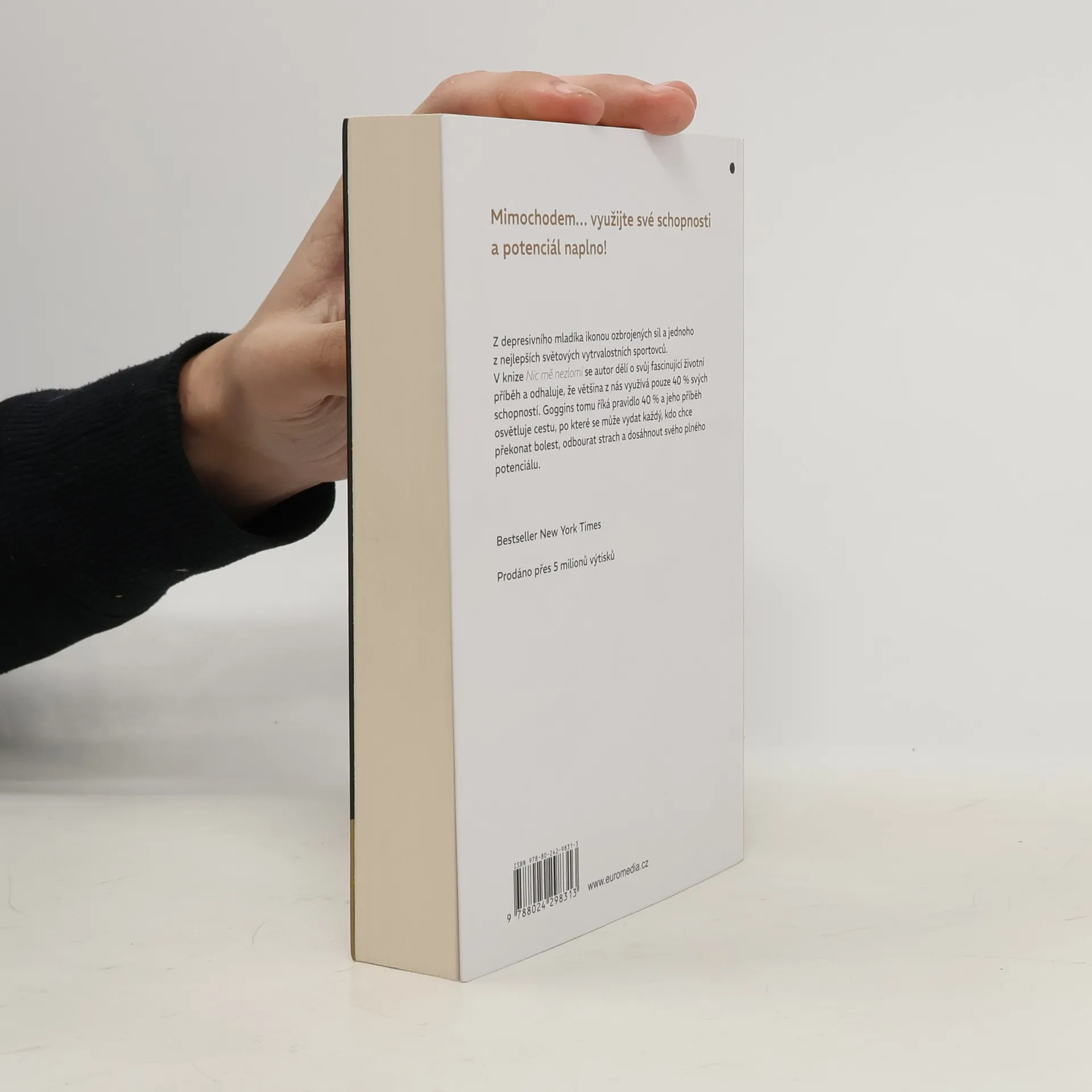 Dětství Davida Gogginse bylo noční můrou - chudoba, předsudky a fyzické týrání ho velmi poznamenaly. Díky sebekázni, psychické odolnosti a tvrdé práci se však Goggins proměnil z depresivního mladíka s nadváhou v ikonu amerických ozbrojených sil a jednoho z nejlepších světových vytrvalostních sportovců. Jako jediný muž v historii absolvoval elitní výcvik příslušníka Navy SEAL, armádního rangera a taktického leteckého dispečera, dále vytvořil rekordy v mnoha vytrvalostních závodech a časopis Outside ho označil za nejzdatnějšího muže v Americe. V knize Nic mě nezlomí se dělí o svůj fascinující životní příběh a odhaluje, že většina z nás využívá pouze 40 % svých schopností. Goggins tomu říká pravidlo 40 % a jeho příběh osvětluje cestu, po které se může vydat každý, kdo chce překonat bolest, odbourat strach a dosáhnout svého plného potenciálu. Bestseller New York Times. Prodáno přes 5 milionů výtisků