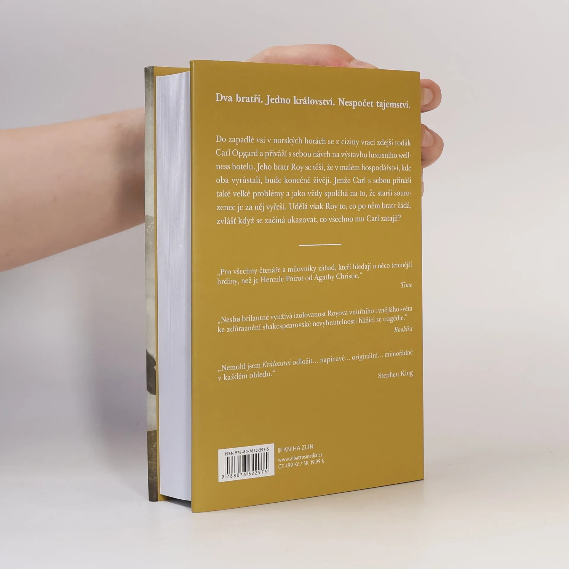 Dva bratři. Jedno království. Nespočet tajemství. Do zapadlé vsi v norských horách se z ciziny vrací zdejší rodák Carl Opgard se svou barbadoskou manželkou Shannon a přiváží s sebou návrh na výstavbu luxusního wellness hotelu. Jeho bratr Roy, který ve vsi provozuje benzínovou pumpu, se těší, že v malém hospodářství, kde po smrti rodičů oba vyrůstali, bude konečně živěji. Jenže Carl s sebou přináší také velké problémy a jako vždy spoléhá na to, že starší sourozenec je za něj vyřeší. Udělá však Roy to, co po něm bratr žádá, zvlášť když se začíná ukazovat, co všechno mu Carl zatajil? „Pro všechny čtenáře a milovníky záhad, kteří hledají o něco temnější hrdiny, než je Hercule Poirot od Agathy Christie.“ Time „Nesbo brilantně využívá izolovanost Royova vnitřního i vnějšího světa ke zdůraznění shakespearovské nevyhnutelnosti blížící se tragédie.“ Booklist „Nemohl jsem Království odložit… napínavé… originální… mimořádné v každém ohledu.“ Stephen King