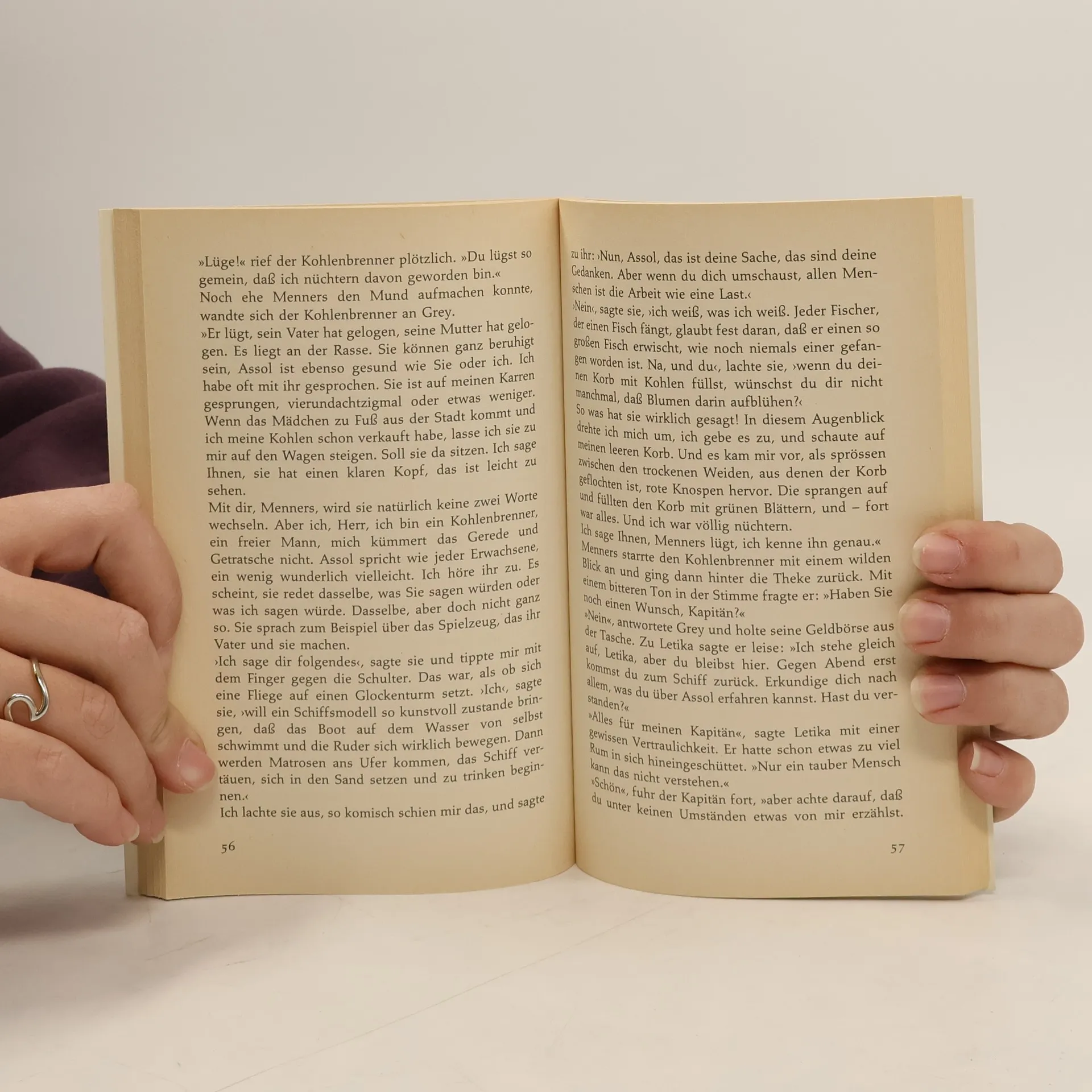 Wie eine fremdartige Blume wächst das Mädchen Assol an einer rauen Meeresküste unter Fischern auf. Eines Tages verkündet ihr ein wandernder Märchenerzähler: »Ein weißes Schiff unter riesigen, leuchtenden Purpursegeln wird die Wellen durchschneiden und geradewegs auf dich zukommen.« An Bord sei ein Prinz, der sie durch seine große Liebe aus ihrem bescheidenen Leben erlöse. Seitdem wartet sie auf dieses Ereignis, lässt sich dafür klaglos verspotten und weiß nicht, dass in einem verwilderten Schloss der Junge Grey von Meer und Seefahrt träumt. Er wird Kapitän auf einem eigenen Schiff und erfährt eines Tages Assols Geschichte. Seit ihrem Erscheinen 1923 hat diese Geschichte Generationen von Leserinnen und Lesern verzaubert.